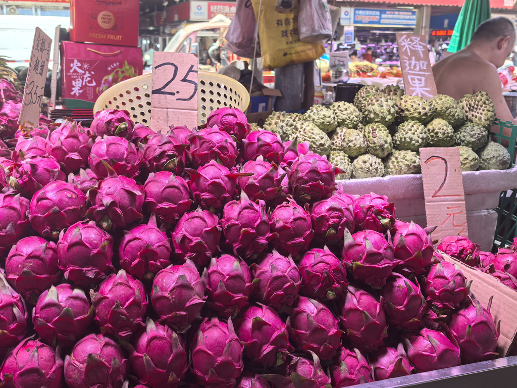 因此赶不了早就没必要太早去,于是中午我们便先去了南宁最大的农贸市场“淡村菜市场”。这个市场确实巨大,但比较了下价格其实没有桂林的黑山早市便宜。而且很多东西也不是明码标价,这样很容易看人下菜。我们甚至碰到同一个商户问的菠萝蜜第一次一个价,逛一圈回来想买变成另一个价了。和桂林一样红肉火龙果很划算也甜,这个可以闭眼入。