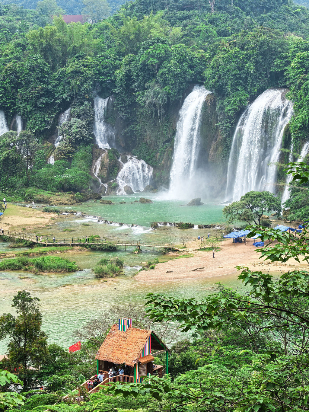 德天跨国瀑布常规玩法是导航到游客中心,然后买景区大巴车坐到10公里外的瀑布检票口开始正式游玩。而检票口区域其实也是有民宿的。只要在里面住宿就可以自驾前往。