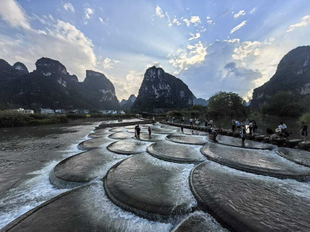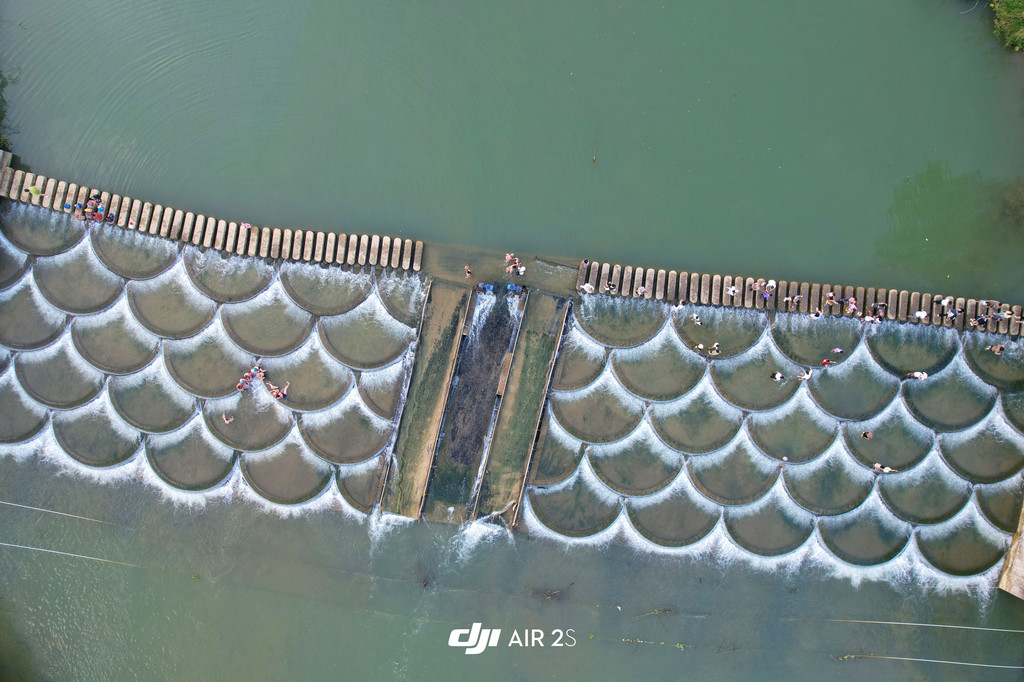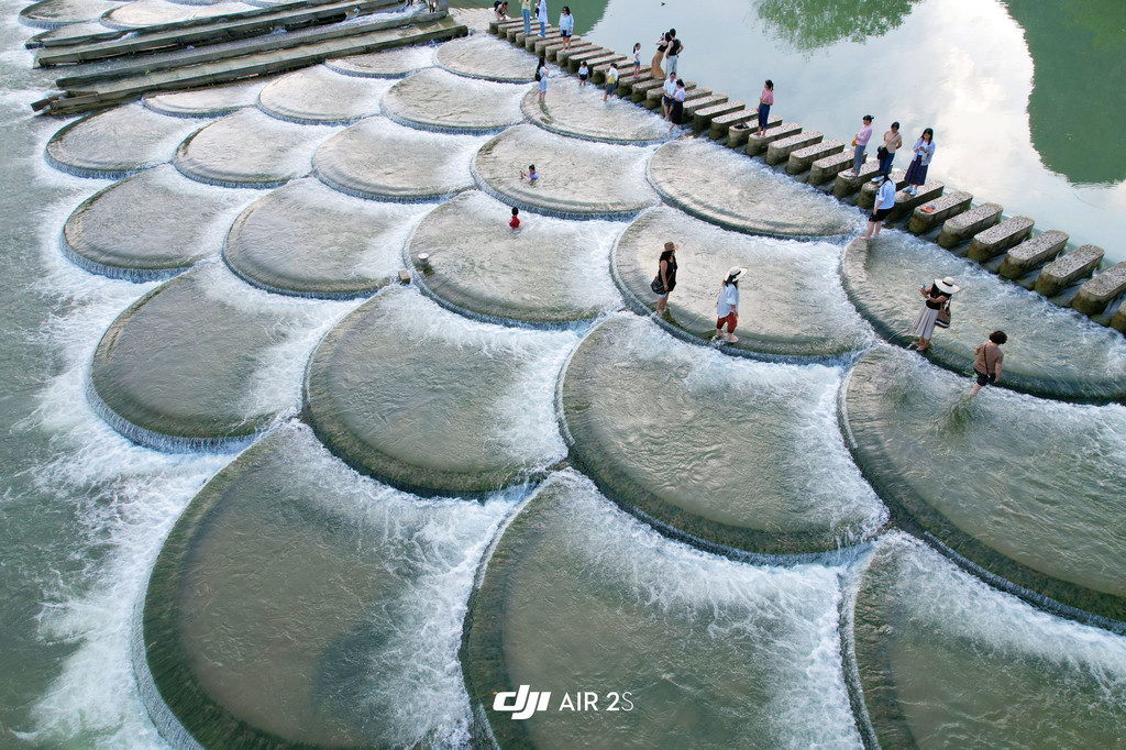 鱼鳞坝如其名,坝的形状如片片鱼鳞般层层叠叠 ,水位不高时可以在坝上踩踩水。