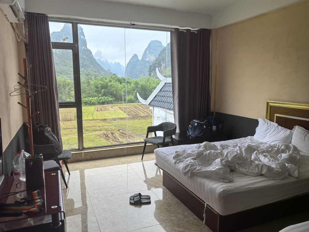 明仕田园这里的酒店民宿有很多打造精良的,但价格都挺贵。我们找的这家在我们预算里的大新明仕香米农家餐馆,差不多的价格这个住宿条件就是比其他地点住的差。对住宿有要求的,得在这里提高预算。