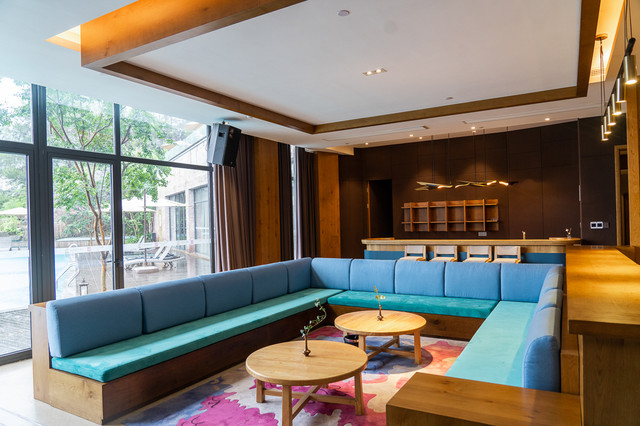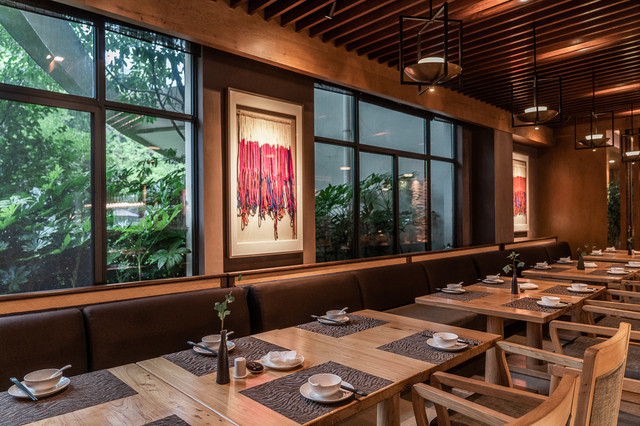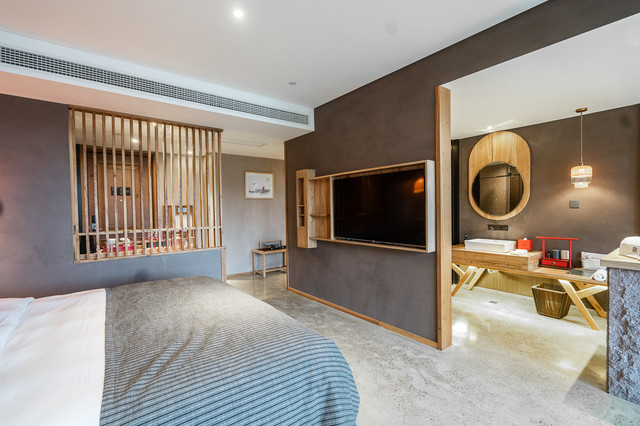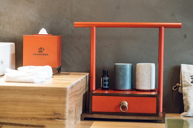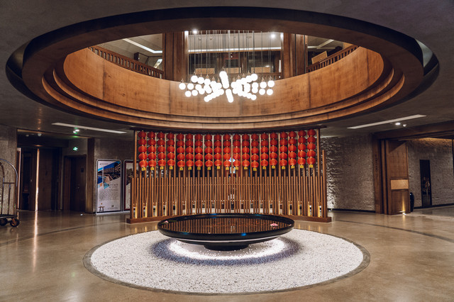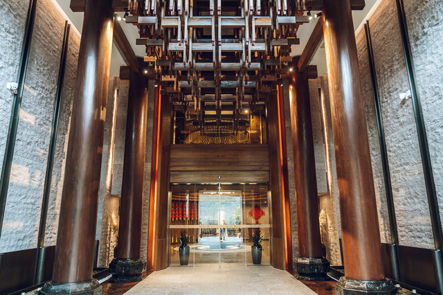 酒店的建筑风格属于现代中式,建筑形状呈“人”字形,寓意着“万物人为本”。酒店的内饰气宇轩昂,门口铺着从安徽老宅收集来的青石,长廊擎着从马来西亚森林运来的大圆柱,朴拙的墙壁,看似不加修饰,但每一条纹路,透出的都是独具匠心。