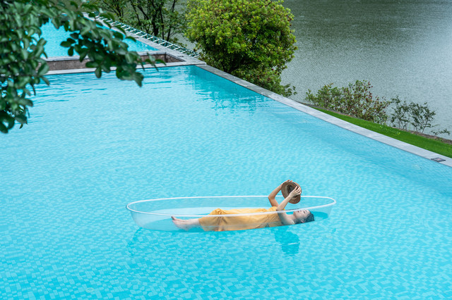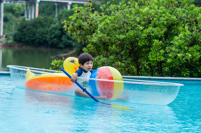 风景秀丽的无边泳池配上网红玻璃船,不论是成人还是儿童,都能玩上一整天拍上一整天,而且随手就是人像大片。