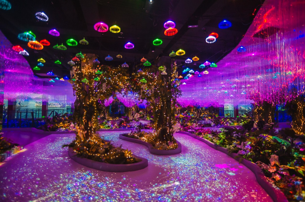 ✅第二部分是爱丽丝仙境般的童话世界,四周环境包括脚下都是五彩缤纷的光影,还有模拟小动物互动,太有爱了!荷叶田田,上岛感受流光溢彩的大森林,仿佛浸染于日月星辰光辉中。