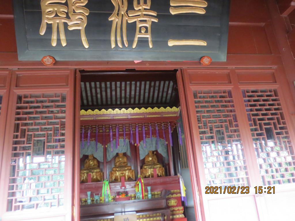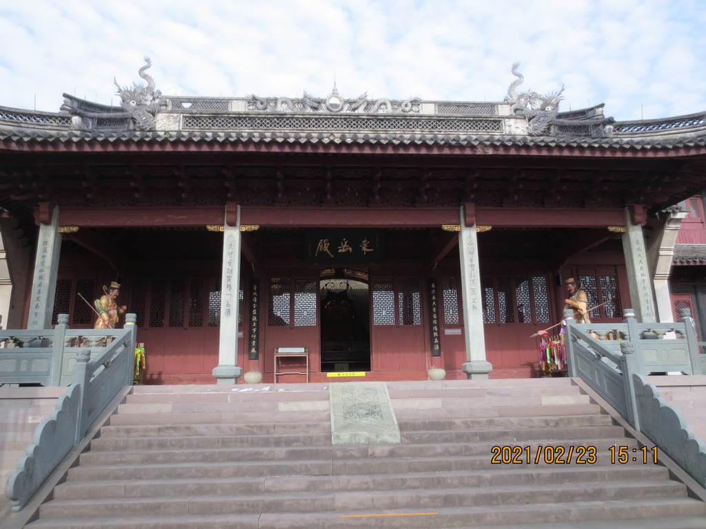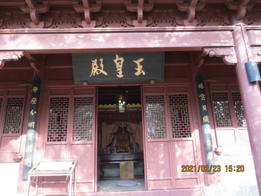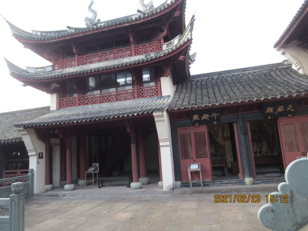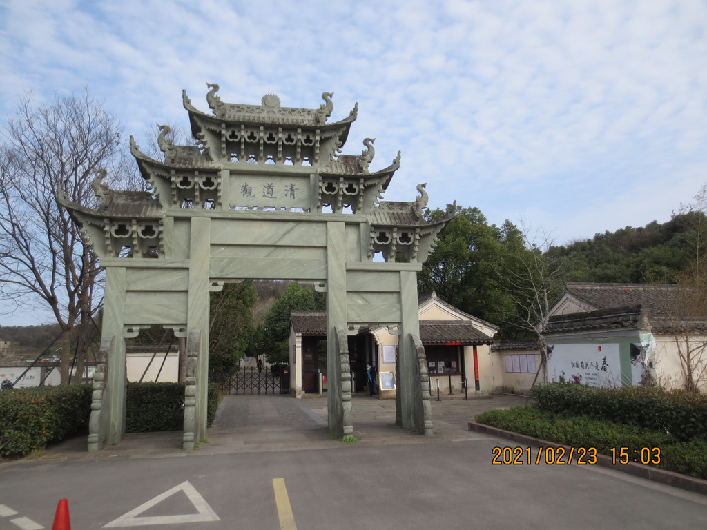 从冯俞宅出来,沿太阳殿路往东行至公路,沿公路往南走一里路,先去新修建的城门,再到对面的清道观,它历史悠久,是江浙最负盛名的道观之一。据县志载,清道观始建于唐天宝八年(749年),后废。南宋绍兴三十年(1160年)由道士叶景虚重建,时在道观右侧建东岳行宫,请尚书楼钥题匾额,观名为“列仙游馆”。明洪武二十四年(1391年),道士王智静将邻近“至道”“崇寿”两宫并入,改称“清道观”。建国后,清道观保存完整。文革中被拆除,山体也被采石炸断,2004年至2007年重建,恢复了山门、仪门、雷祖殿、东岳殿、东岳退居殿、戏台、玉皇殿、三清殿、关圣殿、十王殿等建筑。 清道观内配置的主要神像雷祖、东岳大帝、玉皇大帝、四御及三清等皆为优质桧木精雕而成,清漆淡彩,代表了木制神像的最高水平。