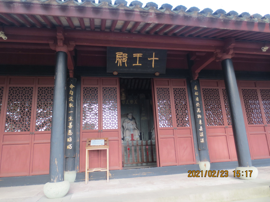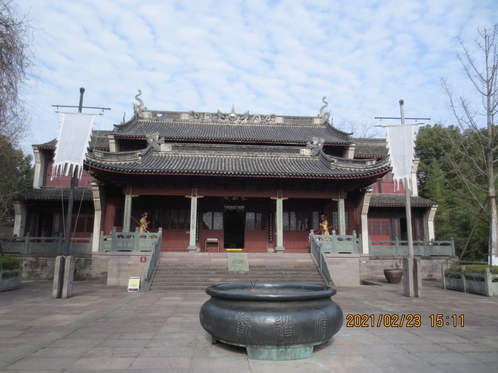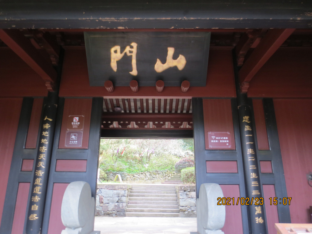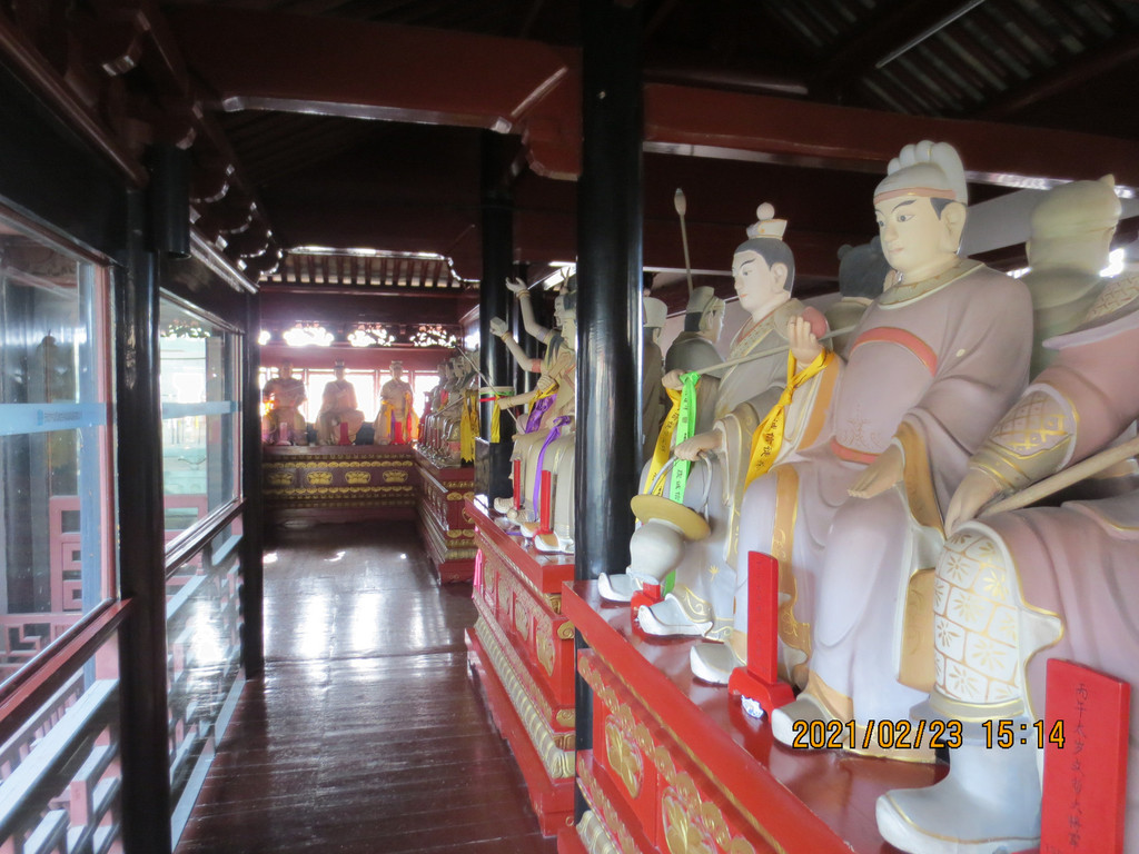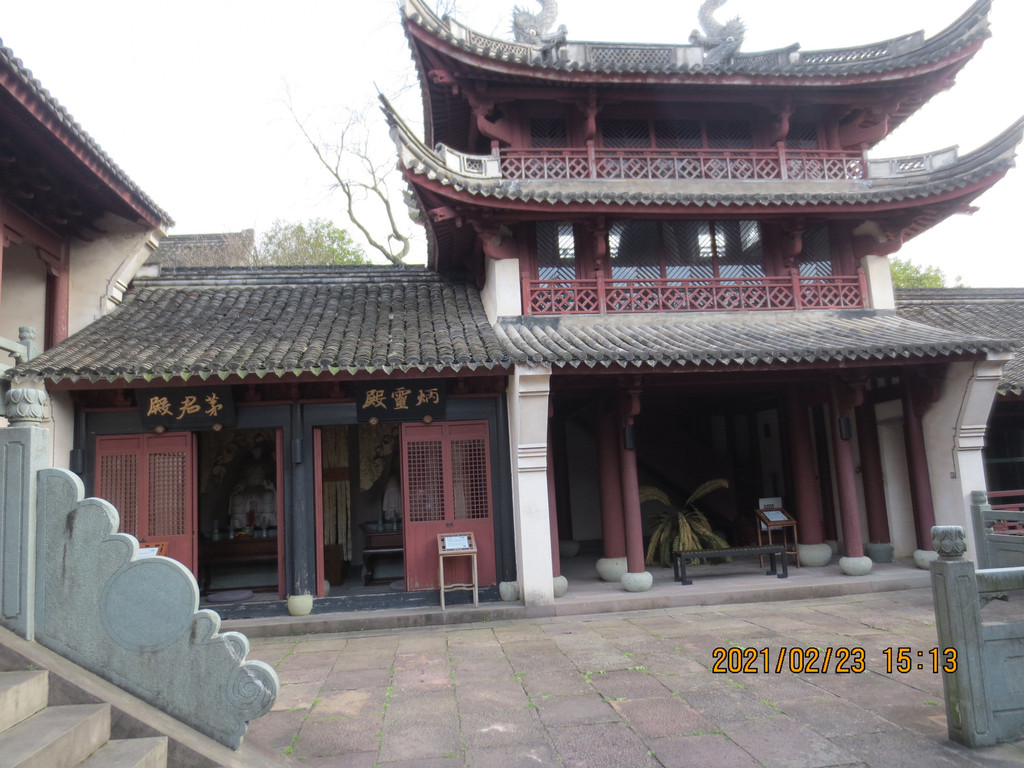 从冯俞宅出来,沿太阳殿路往东行至公路,沿公路往南走一里路,先去新修建的城门,再到对面的清道观,它历史悠久,是江浙最负盛名的道观之一。据县志载,清道观始建于唐天宝八年(749年),后废。南宋绍兴三十年(1160年)由道士叶景虚重建,时在道观右侧建东岳行宫,请尚书楼钥题匾额,观名为“列仙游馆”。明洪武二十四年(1391年),道士王智静将邻近“至道”“崇寿”两宫并入,改称“清道观”。建国后,清道观保存完整。文革中被拆除,山体也被采石炸断,2004年至2007年重建,恢复了山门、仪门、雷祖殿、东岳殿、东岳退居殿、戏台、玉皇殿、三清殿、关圣殿、十王殿等建筑。 清道观内配置的主要神像雷祖、东岳大帝、玉皇大帝、四御及三清等皆为优质桧木精雕而成,清漆淡彩,代表了木制神像的最高水平。