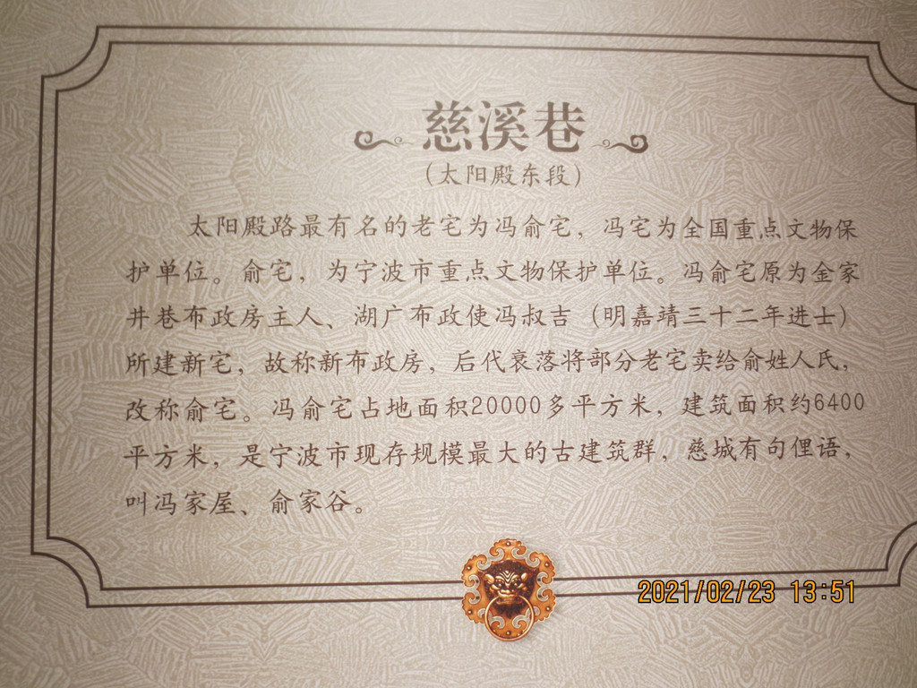 从太湖路往南走下来到太阳殿路左手拐弯的一片建筑群,有慈孝馆、泥金彩绘、冯俞宅等,都是仿古新修建的,慈孝馆、泥金彩绘是免费的,冯俞宅收费的门票40元,冯俞宅规模很大,时间有限又要收费就没进去。