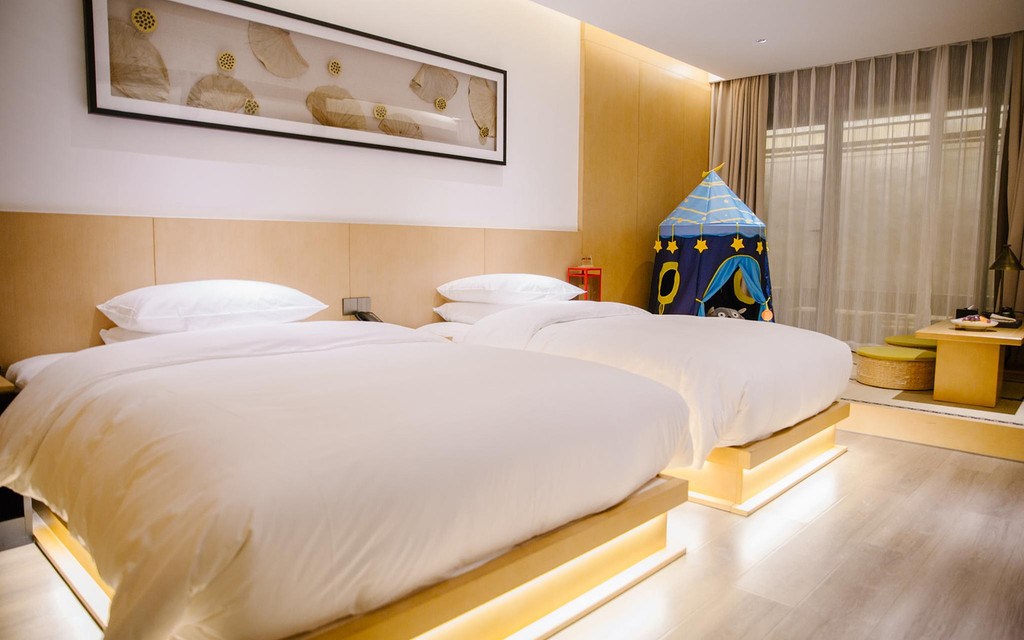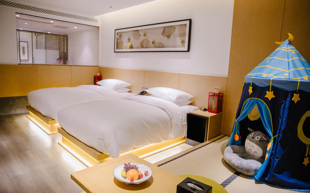 酒店客房被分为云邸、霄厢、孝府、慈轩、医宇、雅居六种居住空间。而我入住的是孝府的一间亲子房,可以和旁边的住户共享同一个院落,推门而进雅致的生活空间里加上童趣的亲子元素,显得别具特色。
