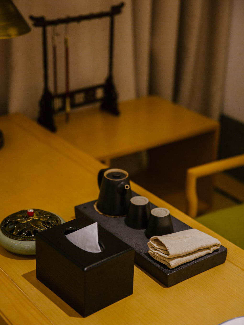 每个房间里都配有地暖,以及壁炉,让每一位住宿者,无论何时来入住都能感受到家的温暖。在摆件上,文房四宝是必备的;