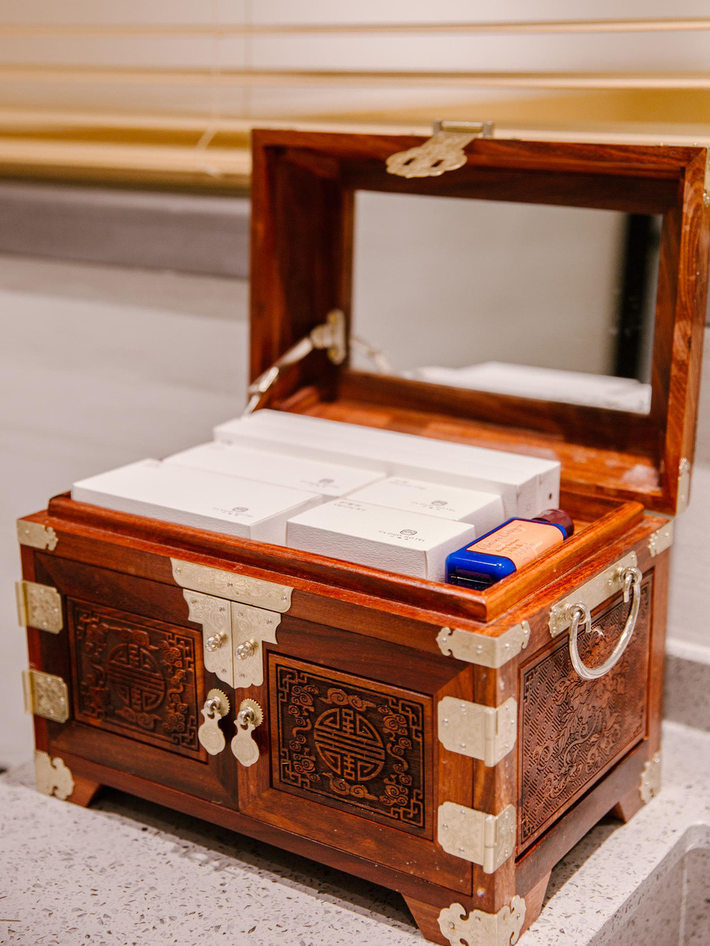 而洗漱用品则被装在朱漆木盒里,仿佛古时的嫁妆盒。