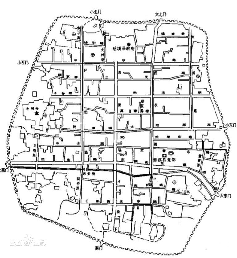 慈城的地形似龟背,双棋盘的格局。三纵六横,依照唐都长安的建筑布局。