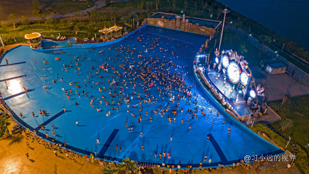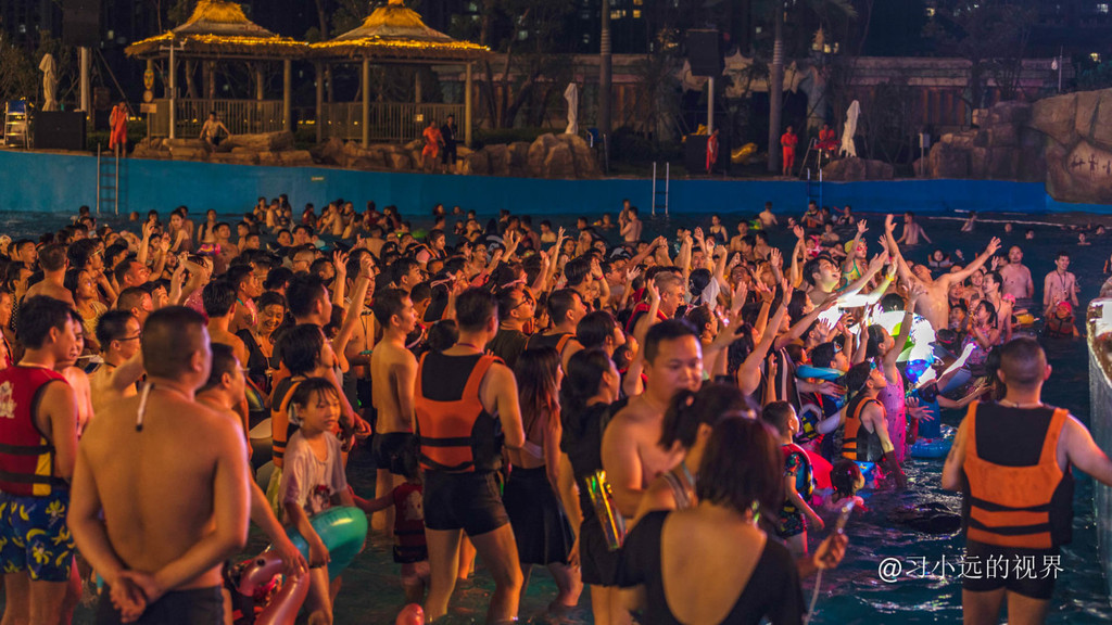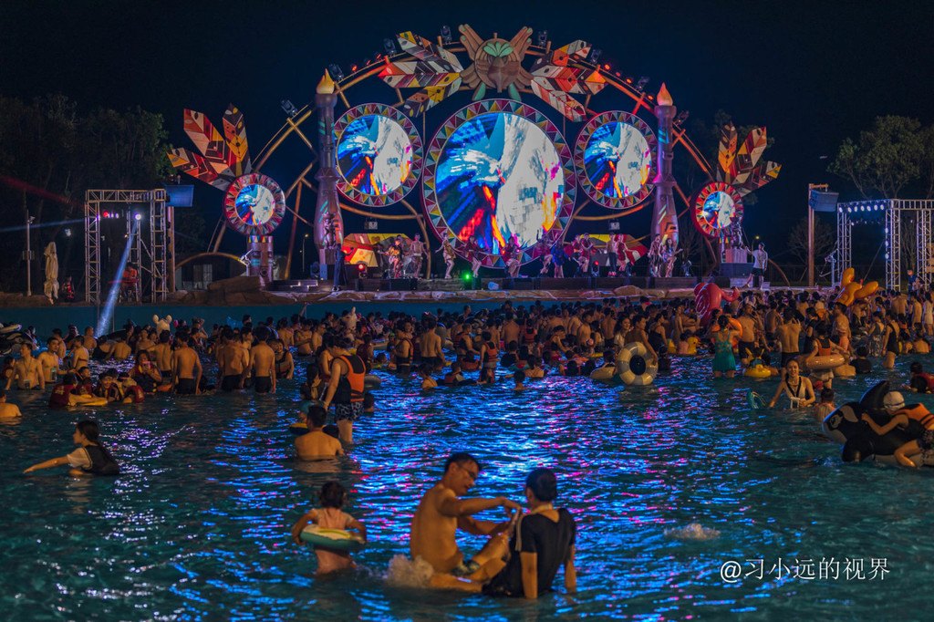 对于我个人来说,燥热的夏天使得活动时间基本都集中在了傍晚开始,对于海皮岛的夜场就是个不错的娱乐时间,一来是因为傍晚之后温度慢慢降下来了,加上这里的小风吹着,别提有多凉快了。夜幕降临之后,这里的夜场就算真正开始了,夜场的主场地主要集中在了造浪池这边,可以看到现场全是人,都在造浪池里疯狂的跟着节奏输出,玩水,狂呼,这样的热闹我也喜欢,偶尔也会凑近到人群里乐呵一下。