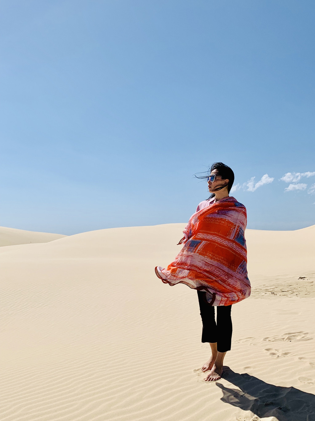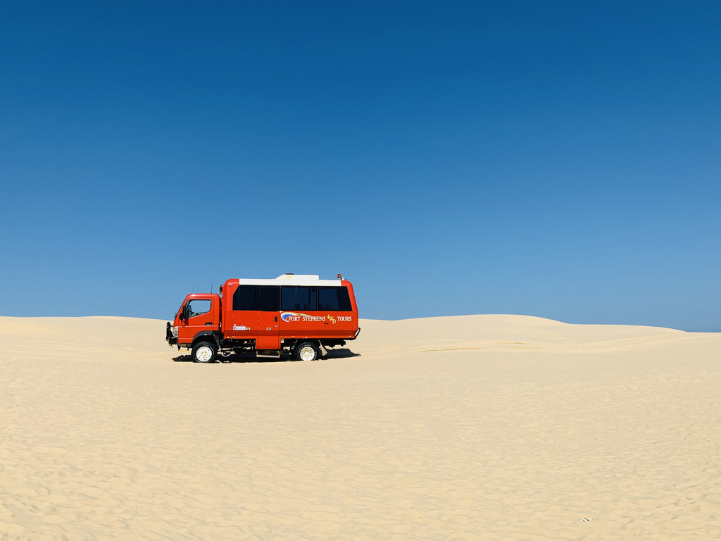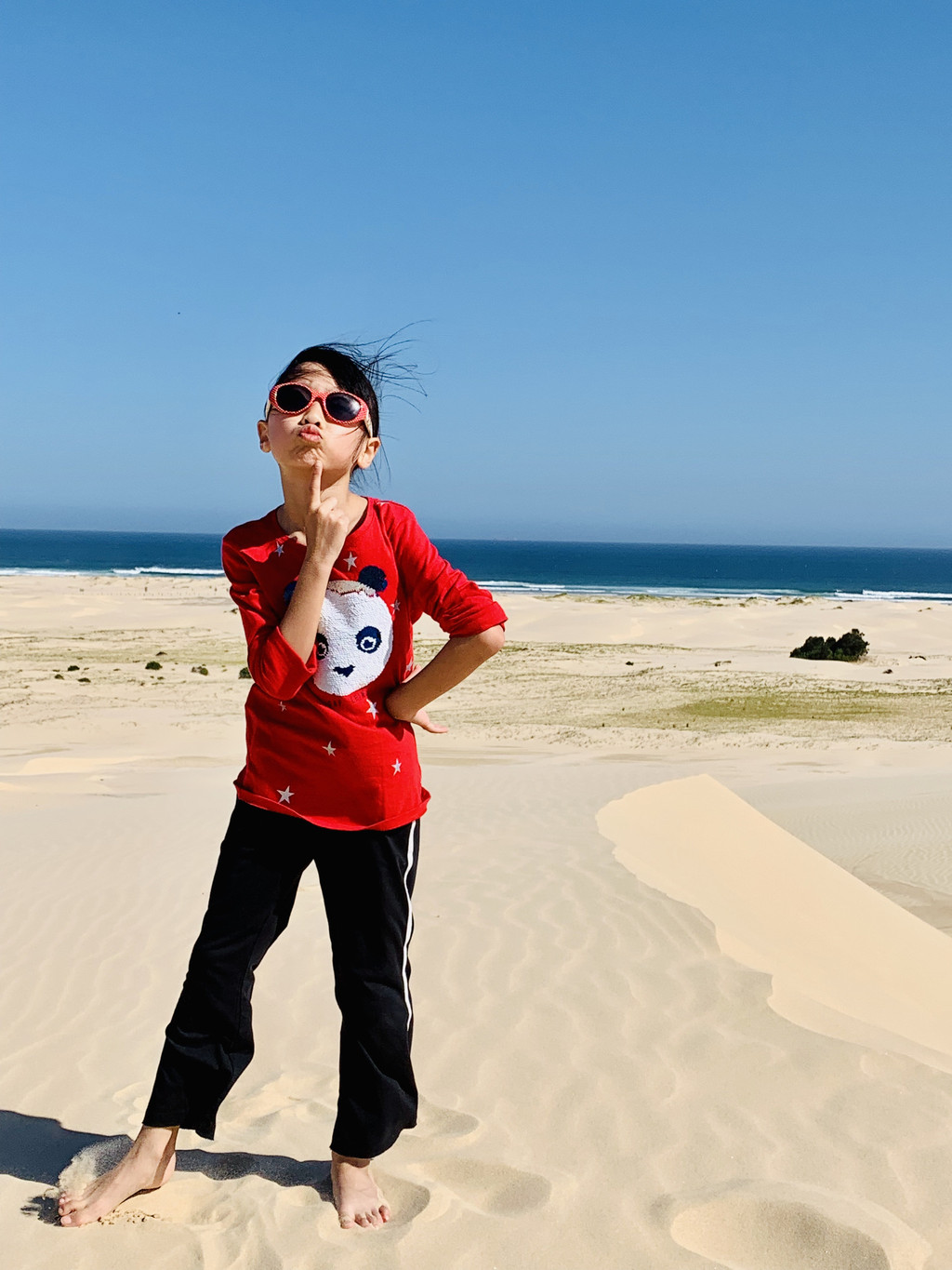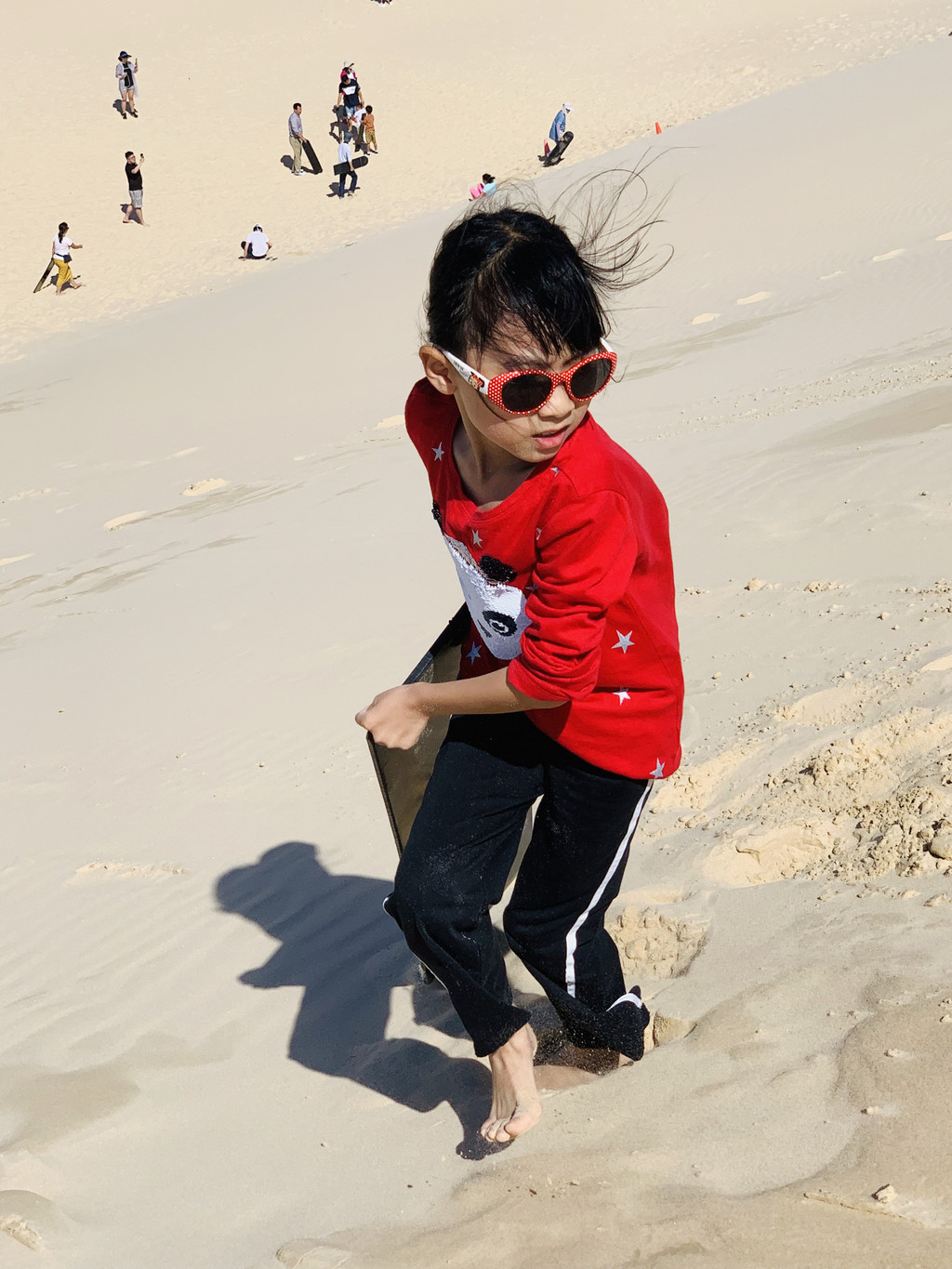 赶紧冲上沙滩,沙滩一眼望去看不到尽头。此时,浪并不大,滩宽而水浅,我们一边玩沙一边戏水。玩了一会,荳妈提议去滑沙点看看,看明天的票今天能不能滑,Good Idea!说完,立即行动,负责滑沙的澳洲大哥看了我们的订单,听说我们的来意,连说:OK,OK,Wellcome!今天运气爆表,我们赶紧回酒店换好衣服来到滑沙场。坐上沙场的专车,不一会就来到了沙场,我们人生第一次滑沙就这样献给了安娜湾。