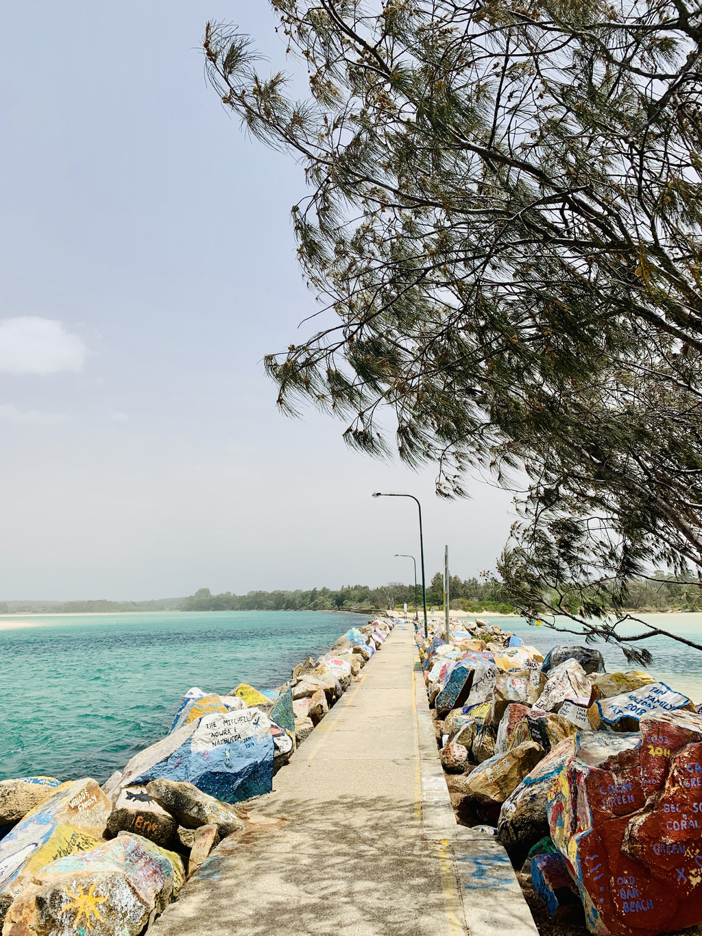 第二天早早起来,小镇在晨辉中慢慢苏醒,小草还挂着露珠,阳光下晶莹透亮,我们迎着朝阳出发了,今天的主菜是科夫斯港大香蕉公园。经过近两小时车程,我们来到另一处著名的楠巴卡黑兹(Nambucca Heads)涂鸦堤,涂满艺术涂鸦的巨石延绵将近一公里,一直延伸到河流的入海口。据说,游客可以在巨石上画上自己心目中的明信片,可惜,我没有油漆,也没有艺术细胞。如果你愿意,下次记得带上画笔,把你的愿望把描绘在巨石上。