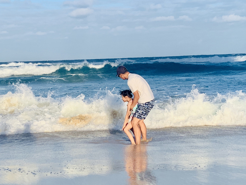 逛到太阳快下山时,我们来到沙滩,黄金海岸沙滩不愧是冲浪者天堂,这里风高浪急,海浪如人潮一样一堆堆向岸边扑来。当天,由于风大,海边挂起了黄旗,完美错过欣赏冲浪勇士的表演。我抱着我家荳妞,一会儿冲向大海,一会儿又冲向岸边,不一会,海水就浸湿了我们的衣裳。