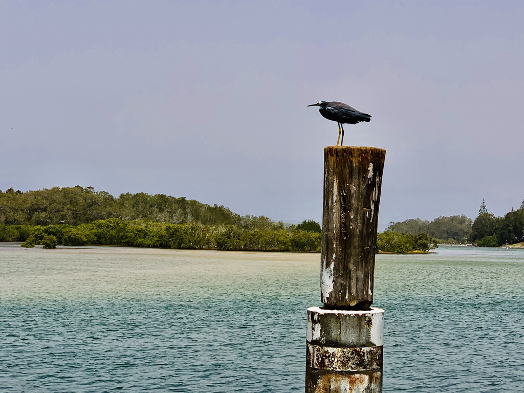 Nambucca河口风景非常漂亮,五彩沙滩、长长栈道,清澈河水,河中,有人在船上垂钓;岸边,水鸟站在木桩注视水面,他们好似要对赌一把,看谁先逮住鱼。