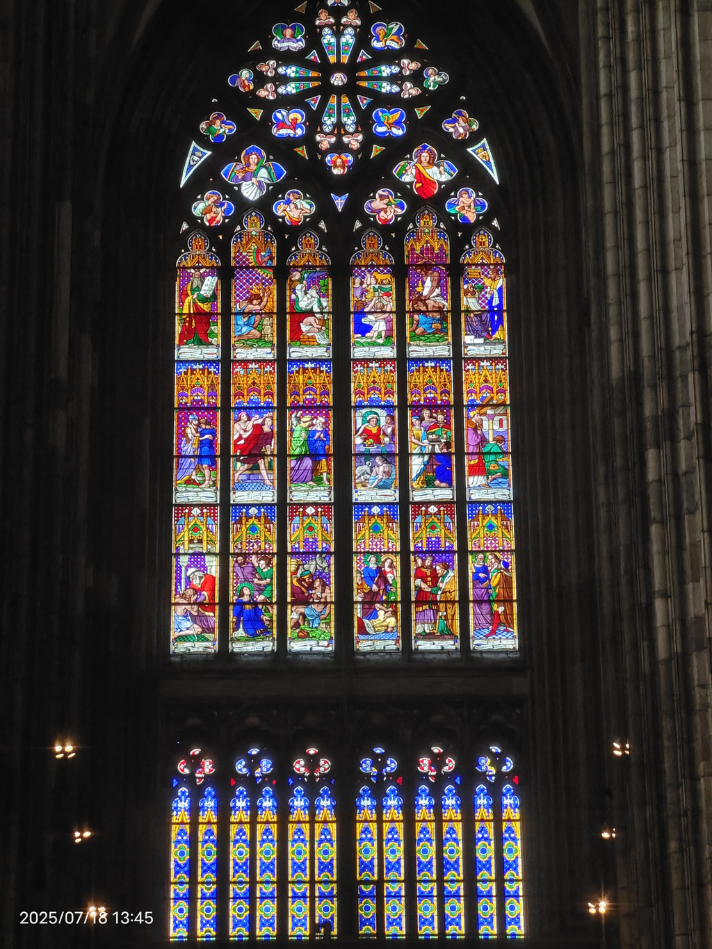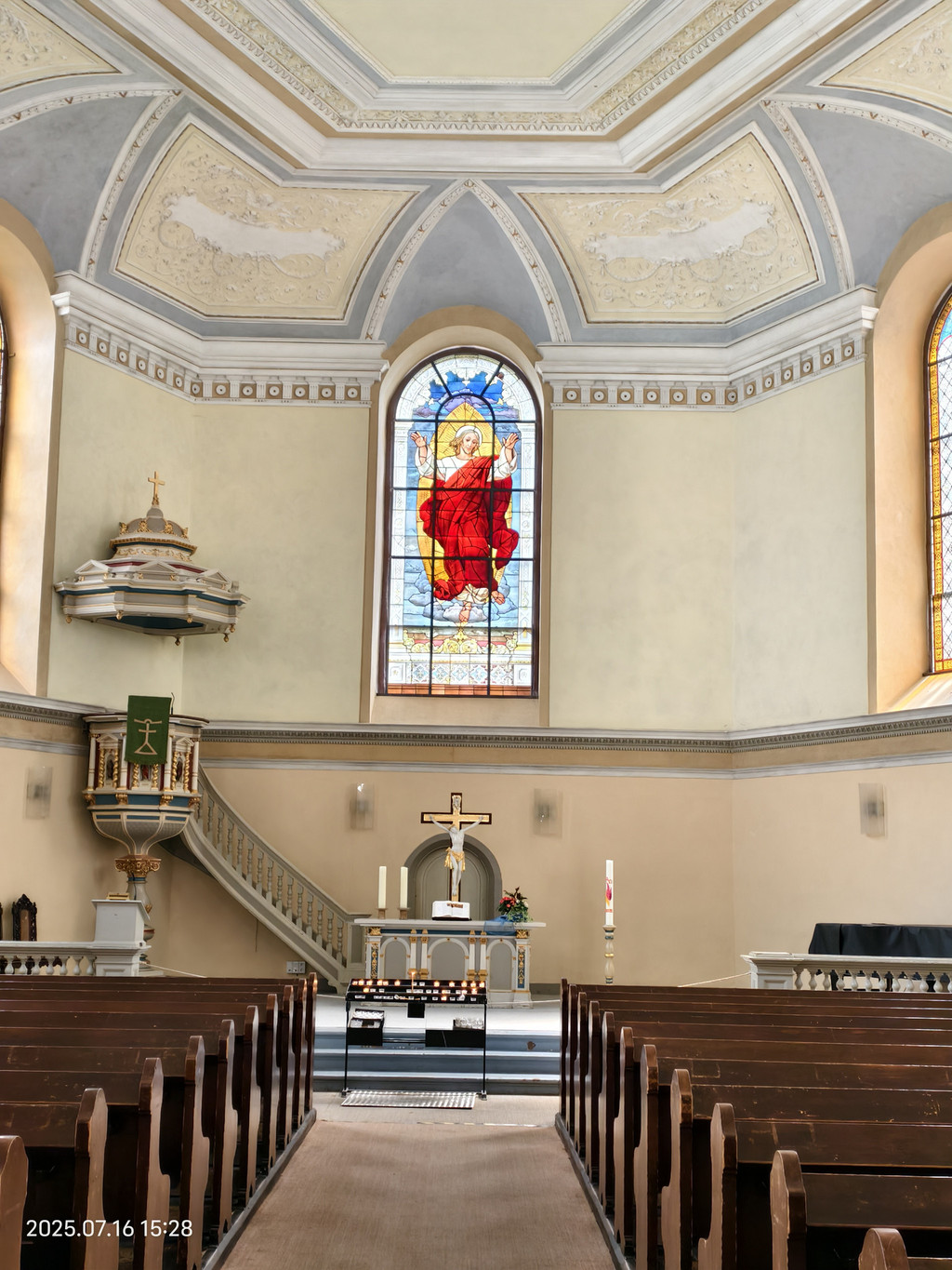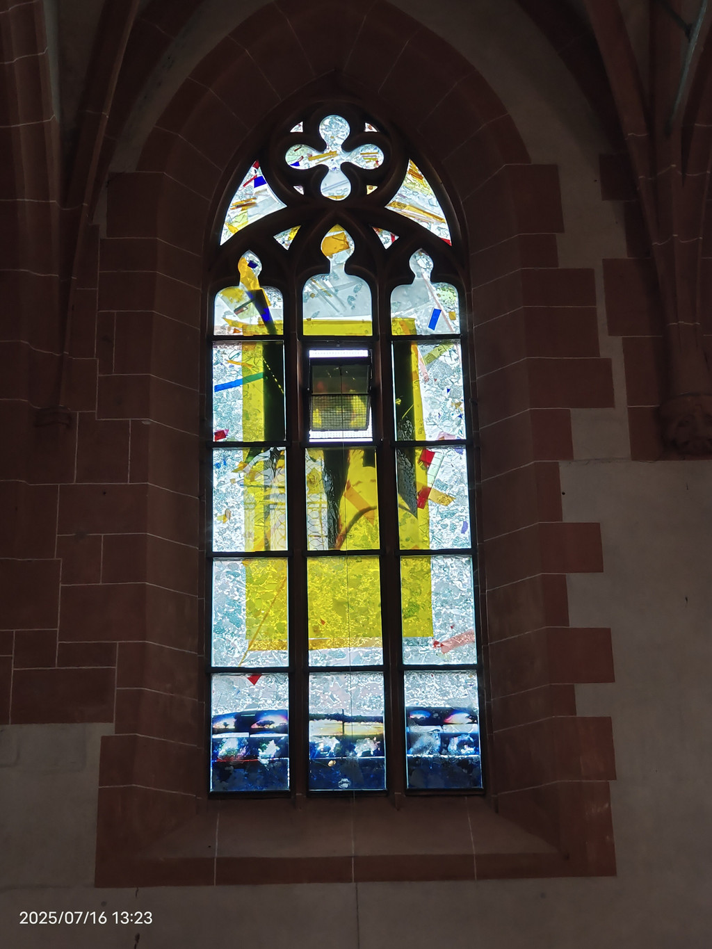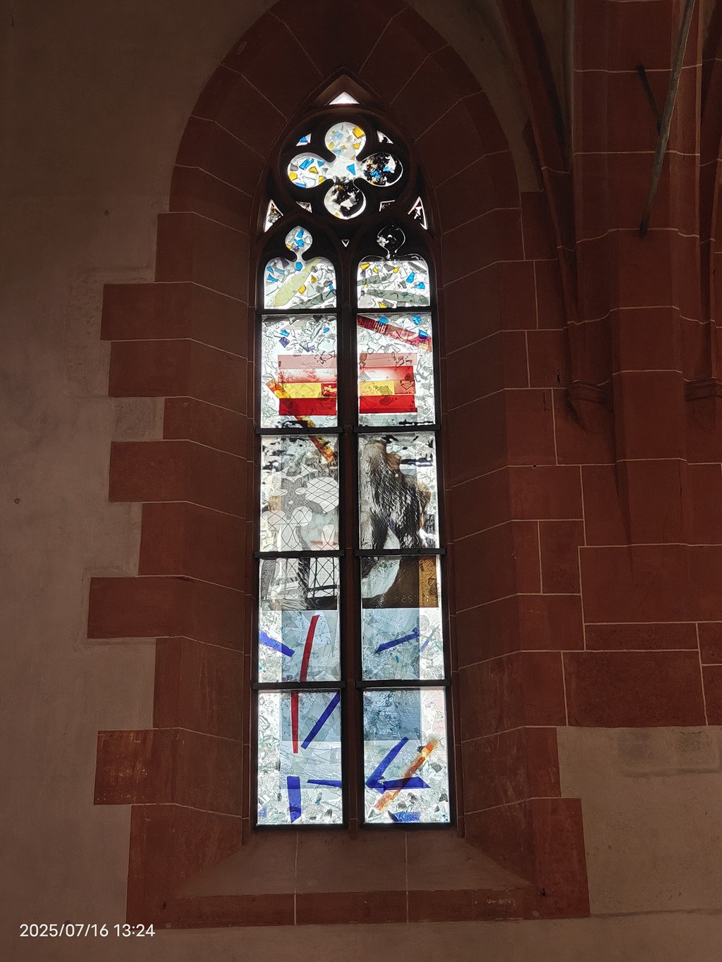 教堂内有一些现代风格的彩绘玻璃窗,为内部空间增添了色彩和灵性。