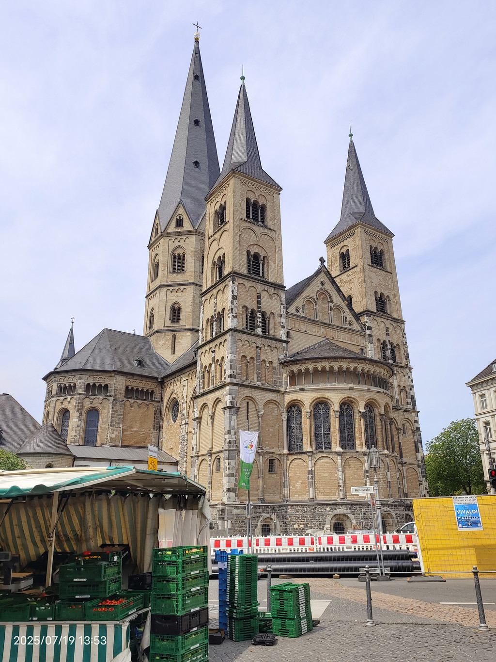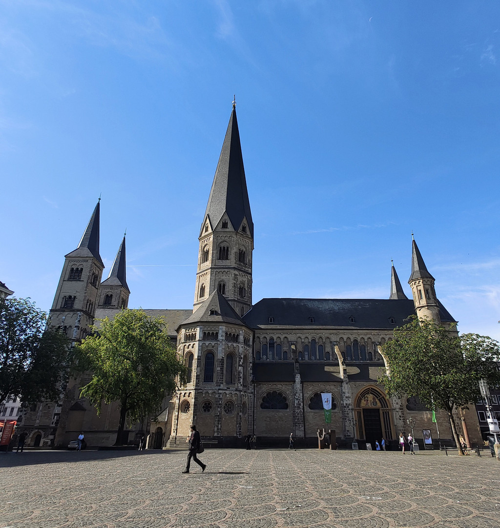 考古发现证明,教堂的地下埋葬着两位罗马殉道者——卡修斯和弗洛雷修斯的遗骸,这里最初曾是一座罗马的殉道者纪念堂。大约在公元11世纪,一座规模宏大的罗马式长方形廊柱大教堂开始在此修建,以容纳前来朝圣的信徒。教堂的建造持续了很长时间,其标志性的十字形塔楼(西塔)最终于13世纪完工,形成了我们今天所见的独特轮廓。这座高达96米的方形塔楼,顶部冠以一个镂空的十字架形尖顶,这种设计在德国乃至全欧洲都非常罕见,成为波恩天际线。