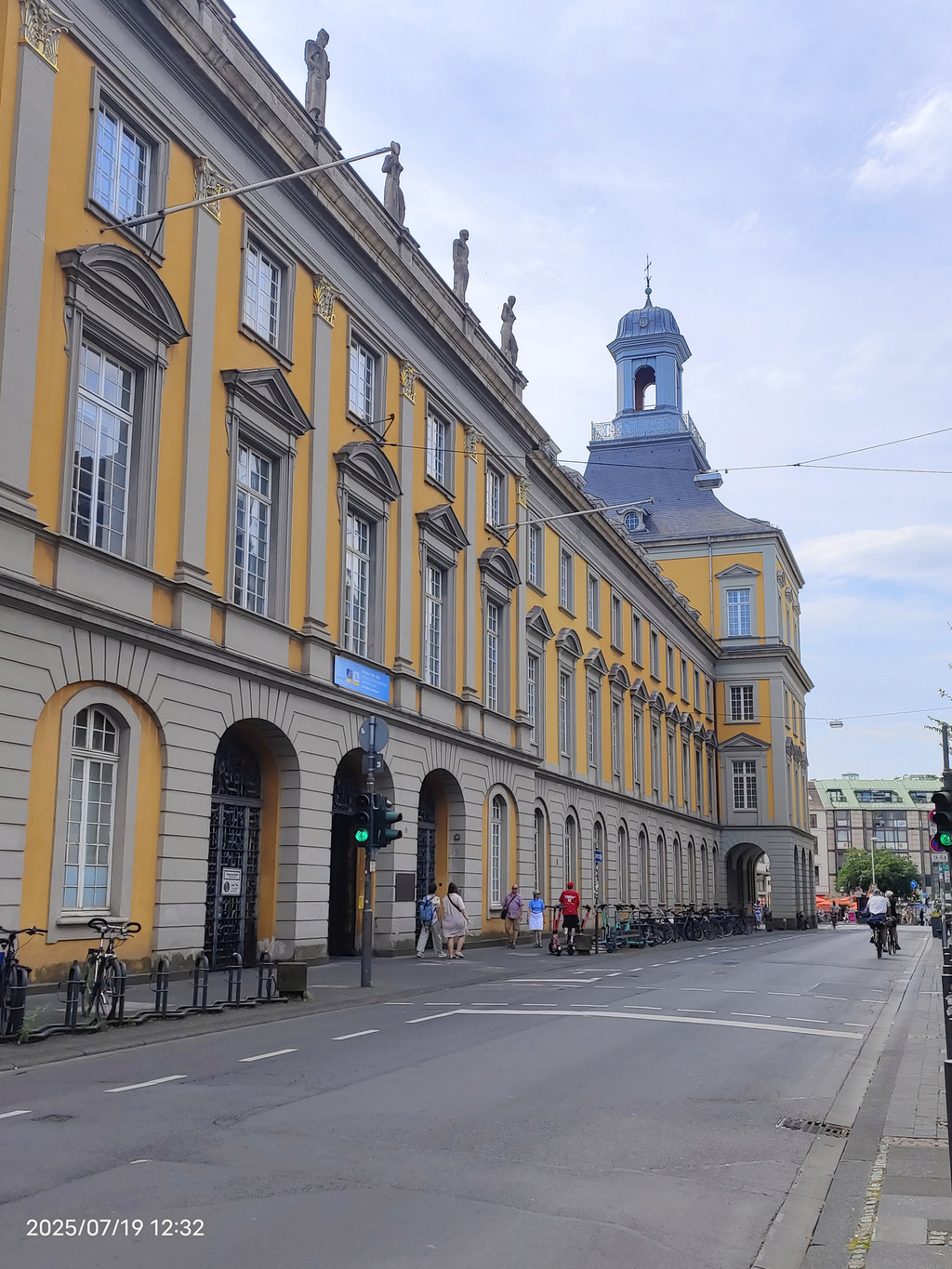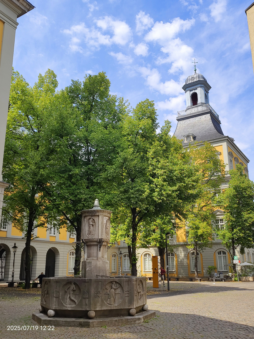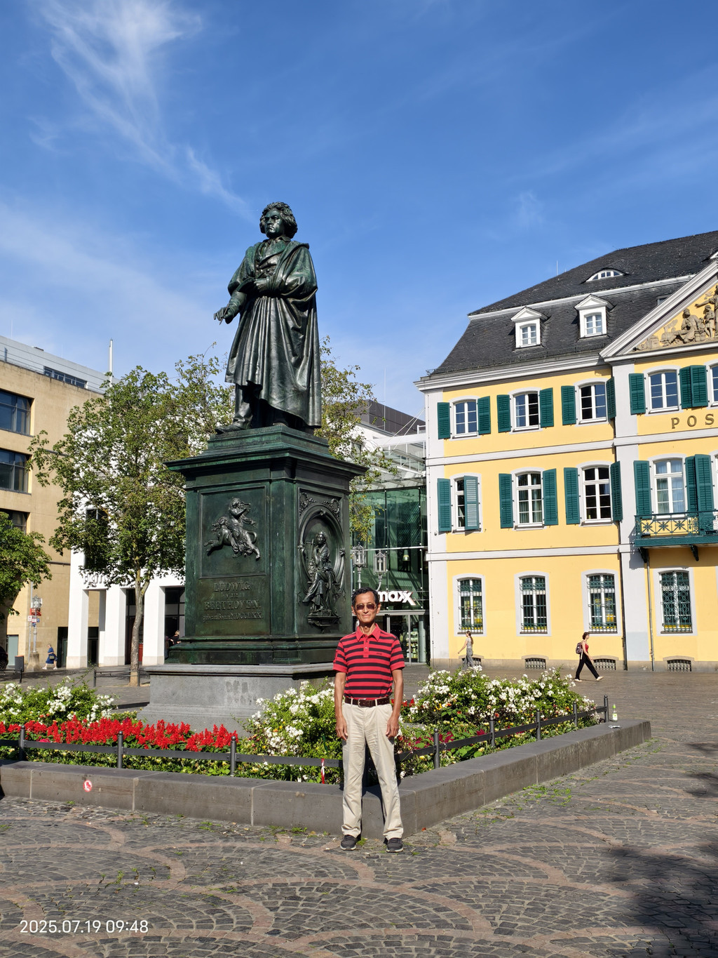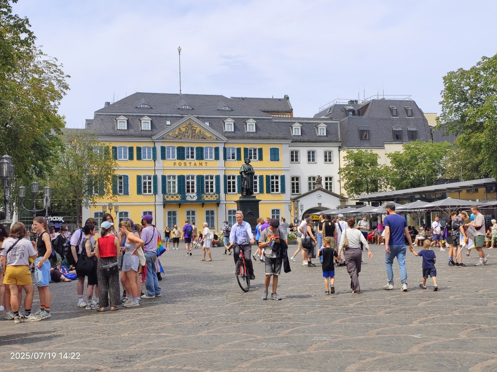 在明斯特广场上树立着这座城市最著名的儿子,路德维希·范·贝多芬雕塑,1845年揭幕,是有史以来为作曲家建造的第一批纪念碑之一。背景黄色的建筑是邮局大楼。