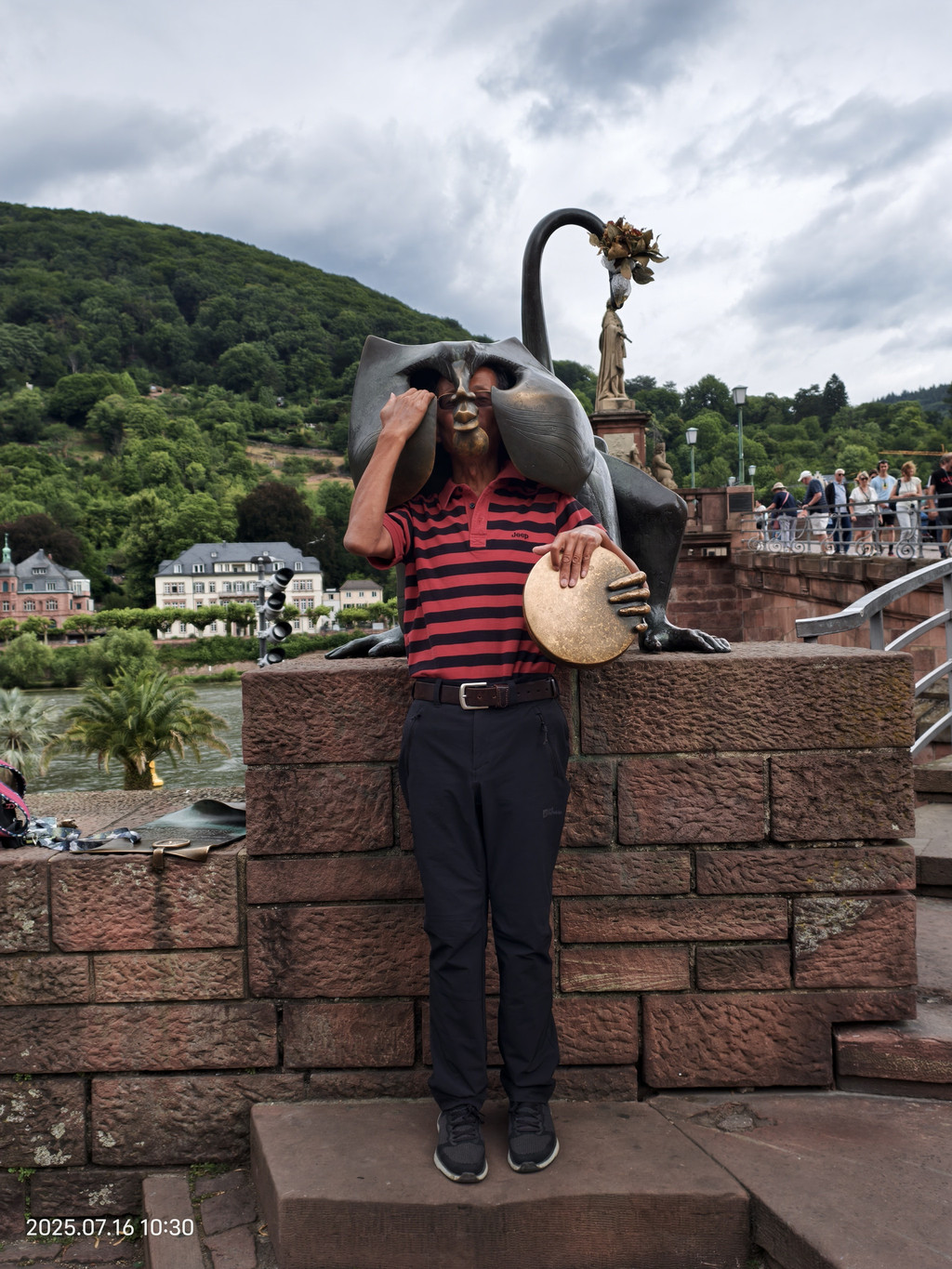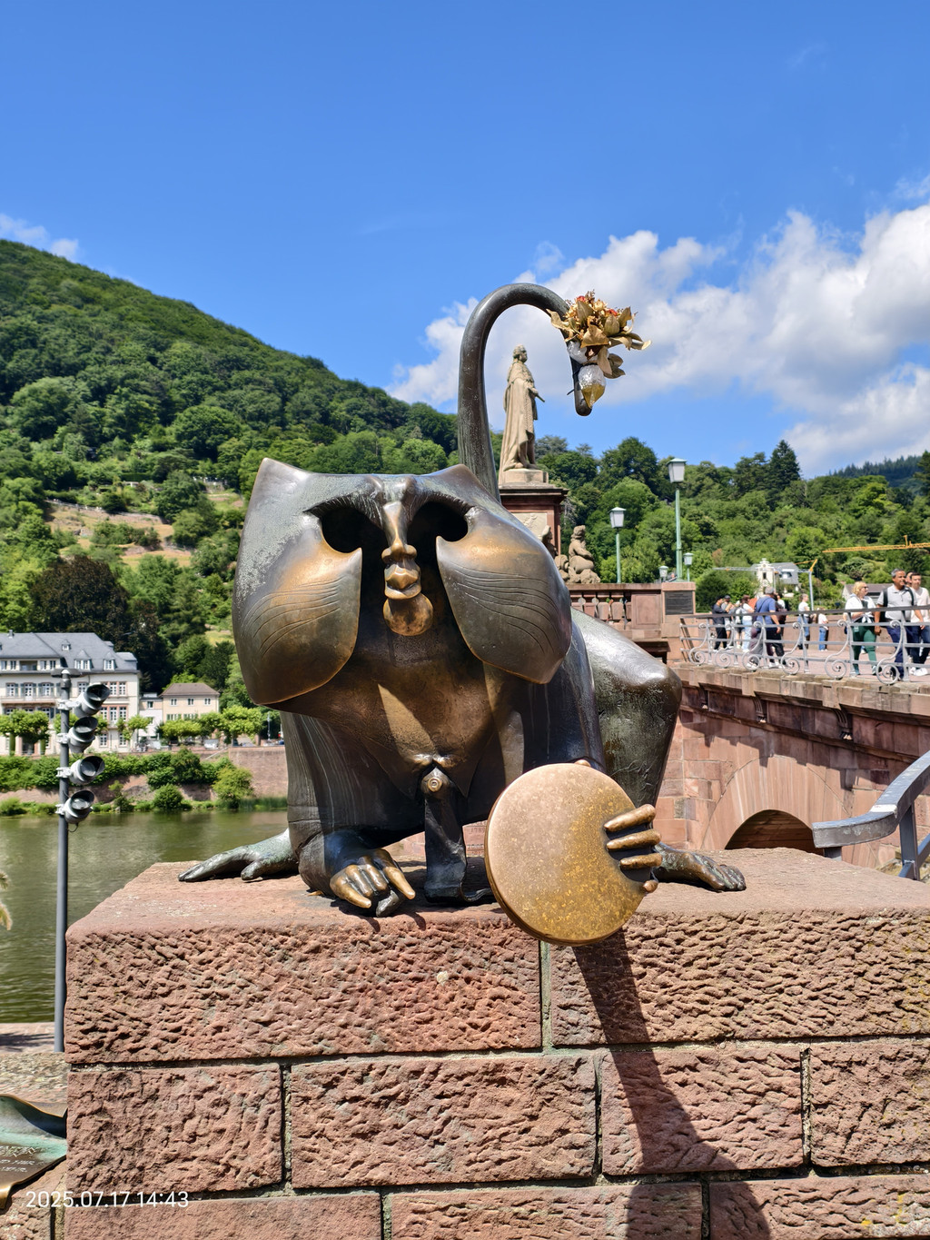 桥门旁边有一个铜猴和一对铜鼠雕塑,最早用于讽刺收取过桥费,现在更多的则是美好的寓意。摸一摸猴子左手所持的铜镜会带来好运,猴子的右手手指会帮助您实现重回海德堡的愿望,而那对铜鼠象征着多子多福。