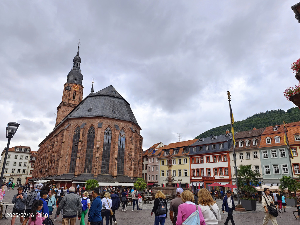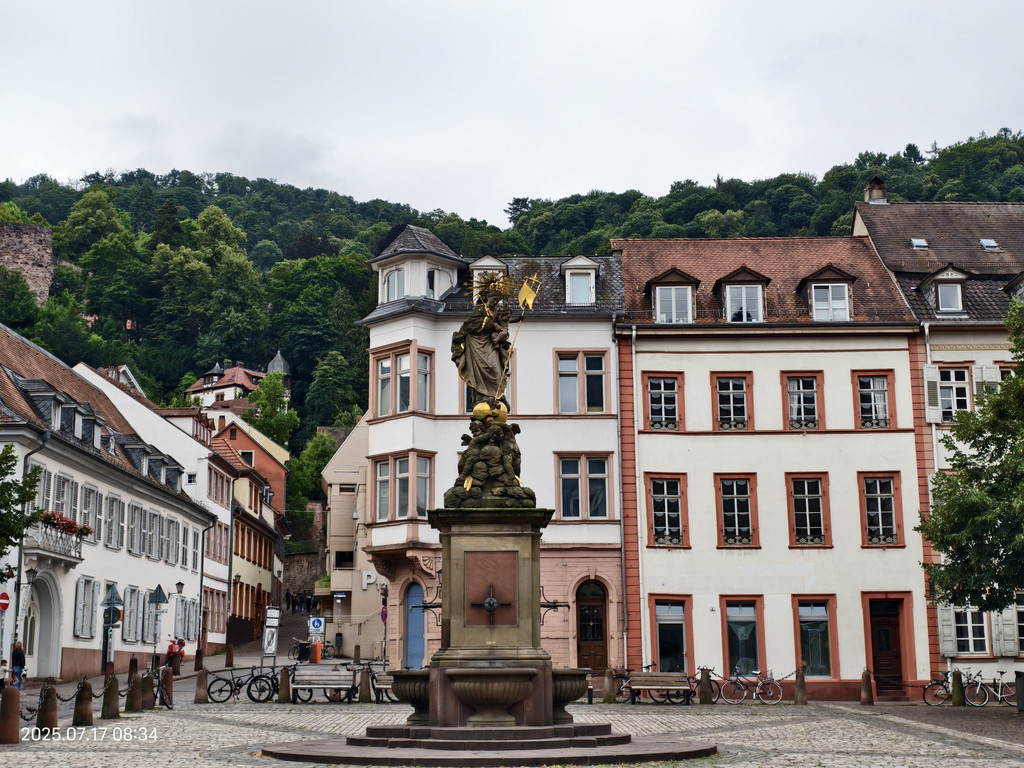 粮食广场中央的立着圣母塑像,广场后的车站通向海德堡城堡。