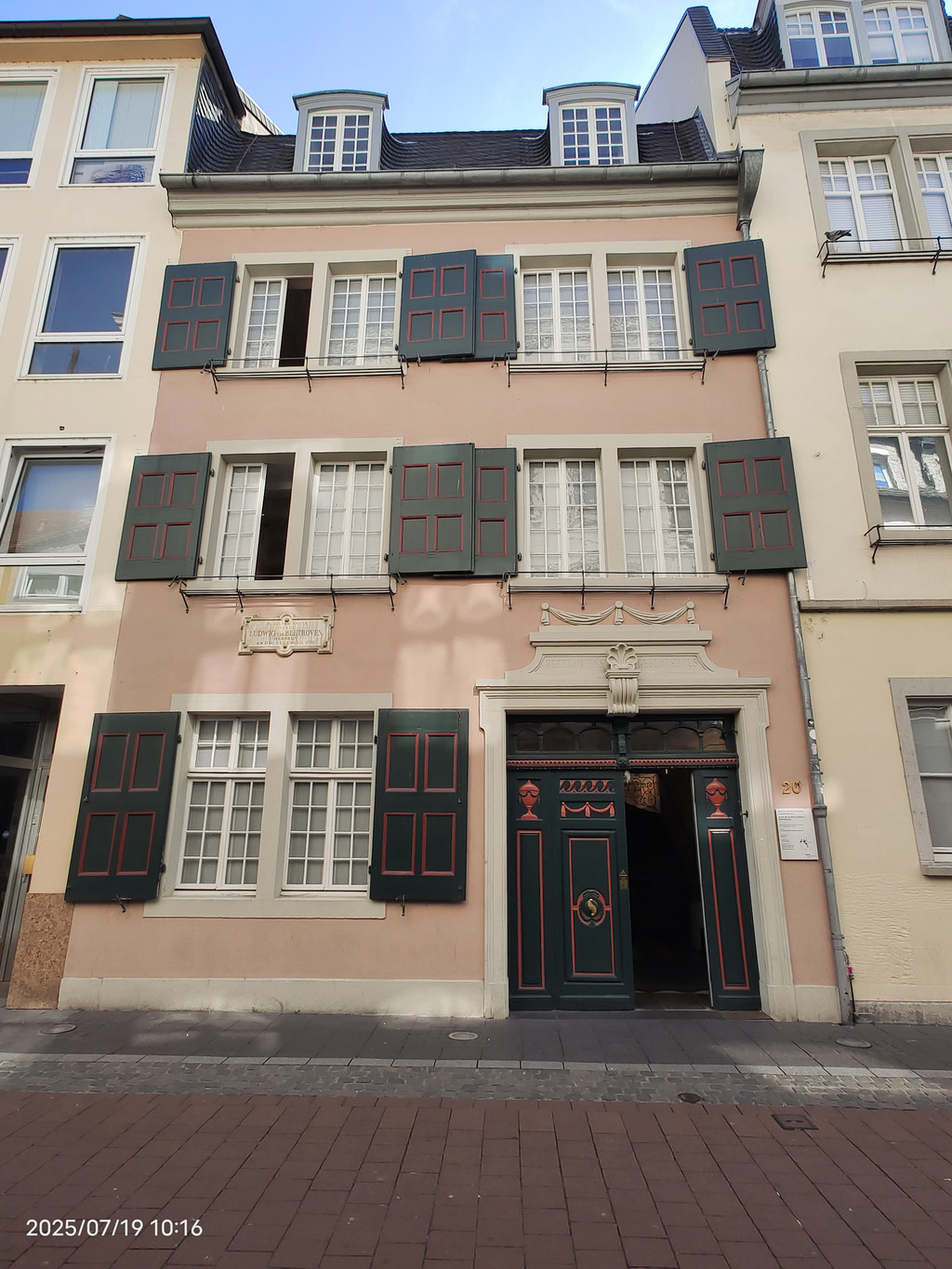 波恩巷20号,是贝多芬1770年的出生地。这座粉色两层民居由贝多芬父母于1767年迁入,1889年面临拆除时由市民集资购得并改建为纪念馆 。现为世界上规模最大的贝多芬生平收藏馆,馆内陈列其手稿、最后一架钢琴及弦乐器等千余件文物 。
