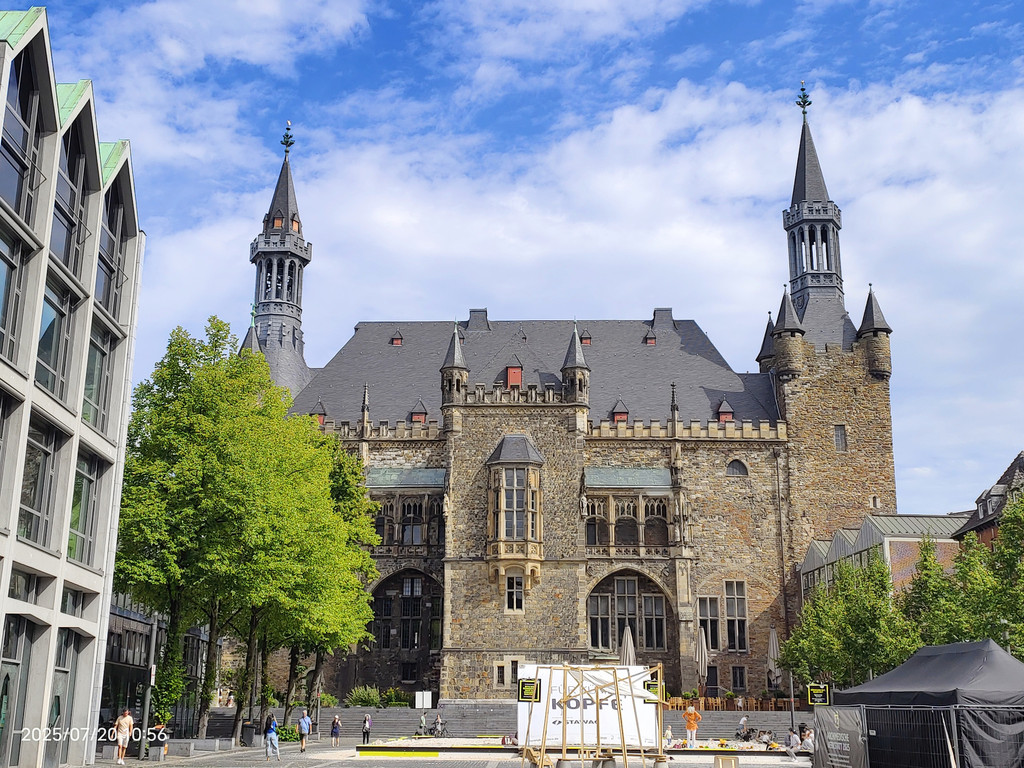 市政厅的地基正是查理大帝庞大的帕拉丁行宫的主体建筑遗址(约800年),这座行宫曾是当时欧洲最重要的权力中心之一。在查理大帝的行宫荒废后,亚琛的市民阶层为了彰显城市的自治权和财富,决定在旧宫殿的基座上建造一座配得上其历史的新市政厅。工程始于约1330年。从1349年开始,每一位在亚琛大教堂加冕的国王,都会在市政厅的加冕庆典大厅 举行盛大的宴会,这一传统持续了数百年。市政厅在历史上多次遭受火灾和战争破坏(特别是在二战中),但都得到了精心的修复和重建,保留了其历史风貌。