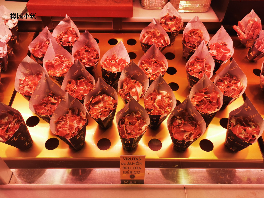 马约尔广场旁有一个巨大的集市,这里的美食丰富,没有座位,很多人就站在柜台前边吃边聊天,这里有西班牙传统油条配巧克力(Churros con Chocolate),也有声名遐迩的海鲜炖饭(Paella),这里的炖饭米粒饱满,吸附了丰富的酱汁,搭配新鲜的海鲜,是马德里炖饭的代表,可惜有些夹生;更有美味的西班牙火腿(Jamon Iberico)和以及丰富的西班牙传统小吃。