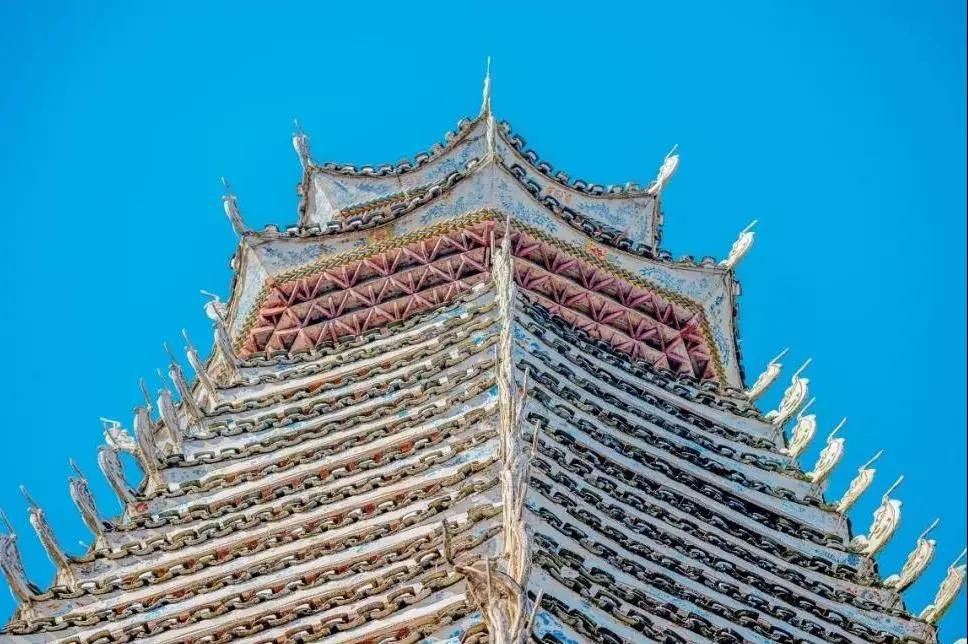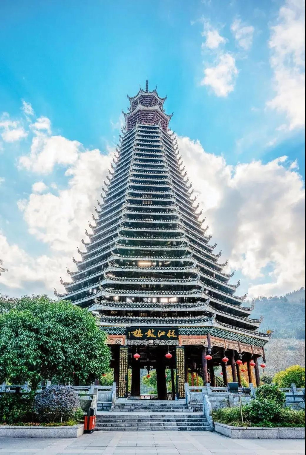 从江鼓楼耸立在都柳江河畔,蔚为壮观,享誉侗乡第一鼓楼美称。占地477平方米,高46.8米,共29层重檐,双层宝顶,平面为八角形。整栋棱均釆用当地的杉木建造,支撑鼓楼由32根柱子顶立,其中楼中四根大柱每根胸围两个成人合抱有余,整栋楼不费一钉一铆卯榫而成。