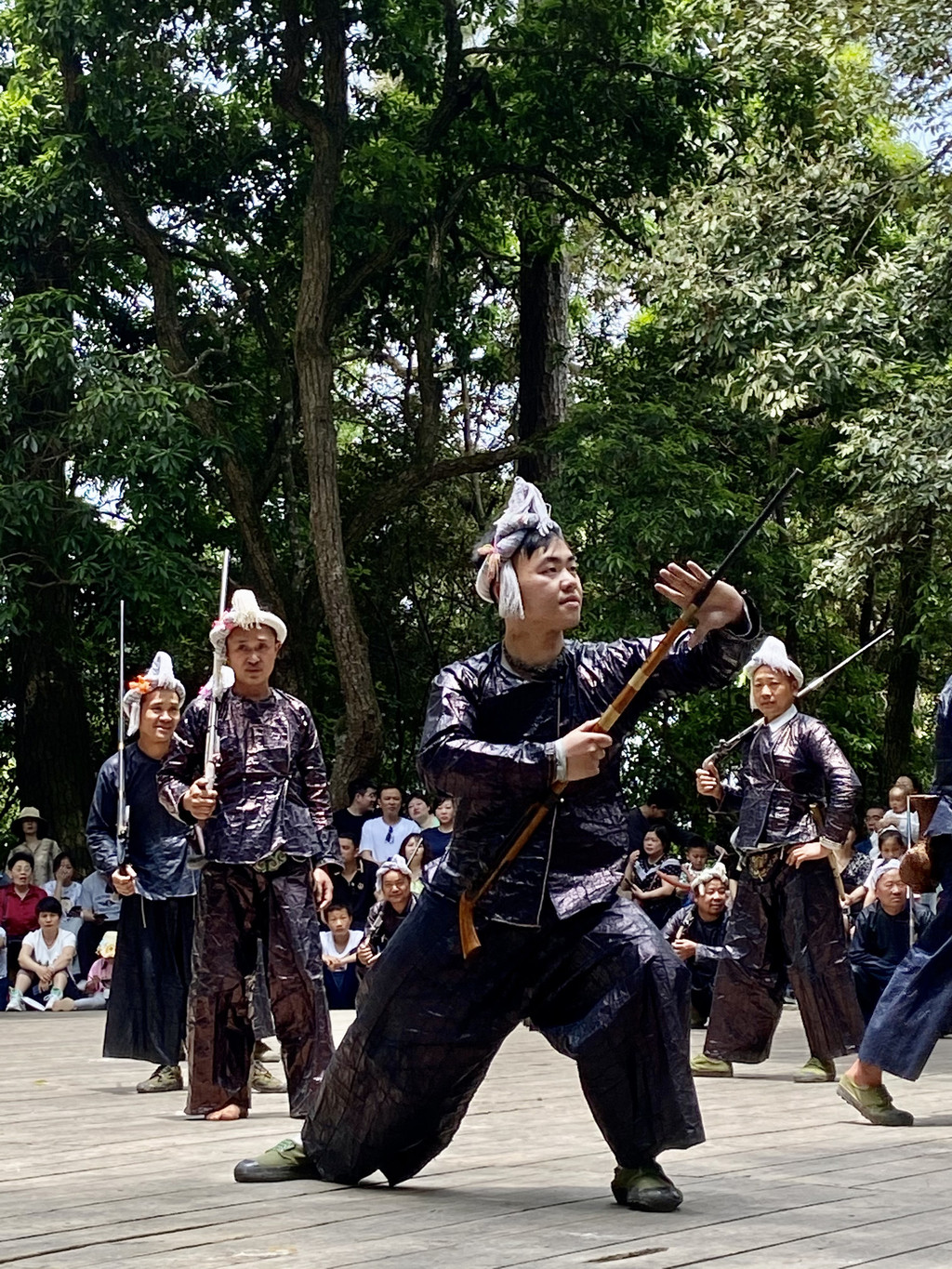 男性成年后,举行成人礼,剃掉头部四周的头发,留中部的发髻。表演的地方在山上,座位有限,盘腿而坐的我们跟地板亲密接触,也近距离的欣赏了现场游客的婚娶“入赘”,感受了他们表演踩踏的力度,真的很用力。表演有交流有互动,感受了他们的热情和对我们外来人的尊重和诚意,是有融入进去的。不枉此行。