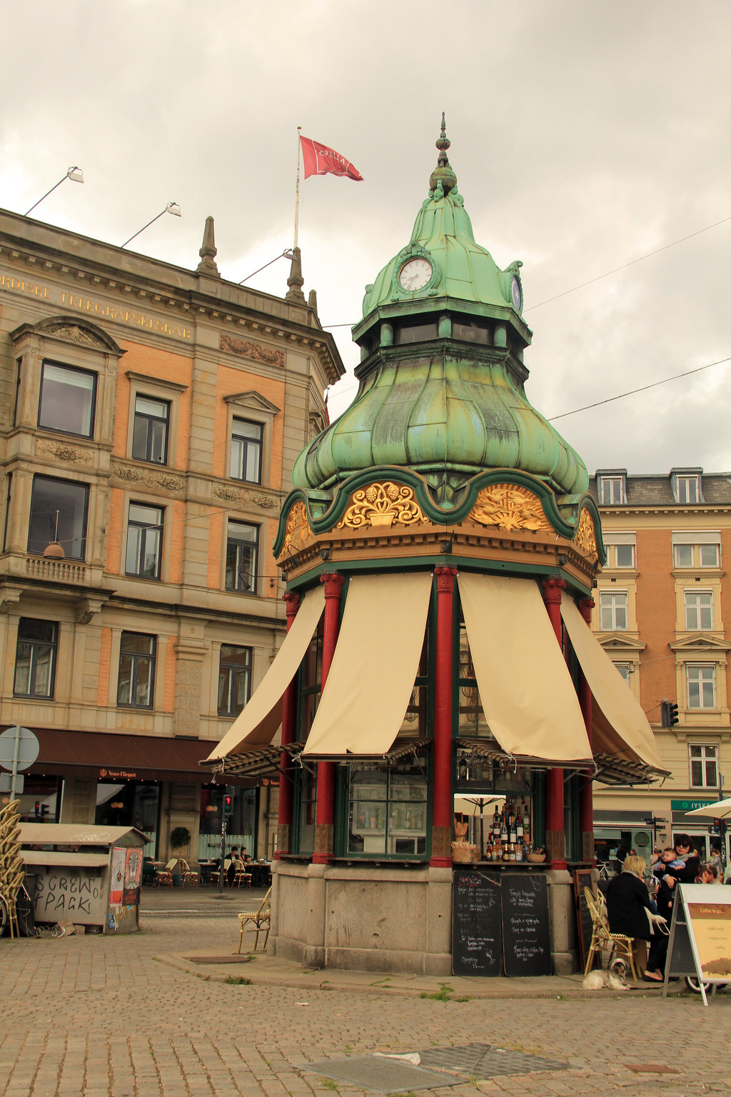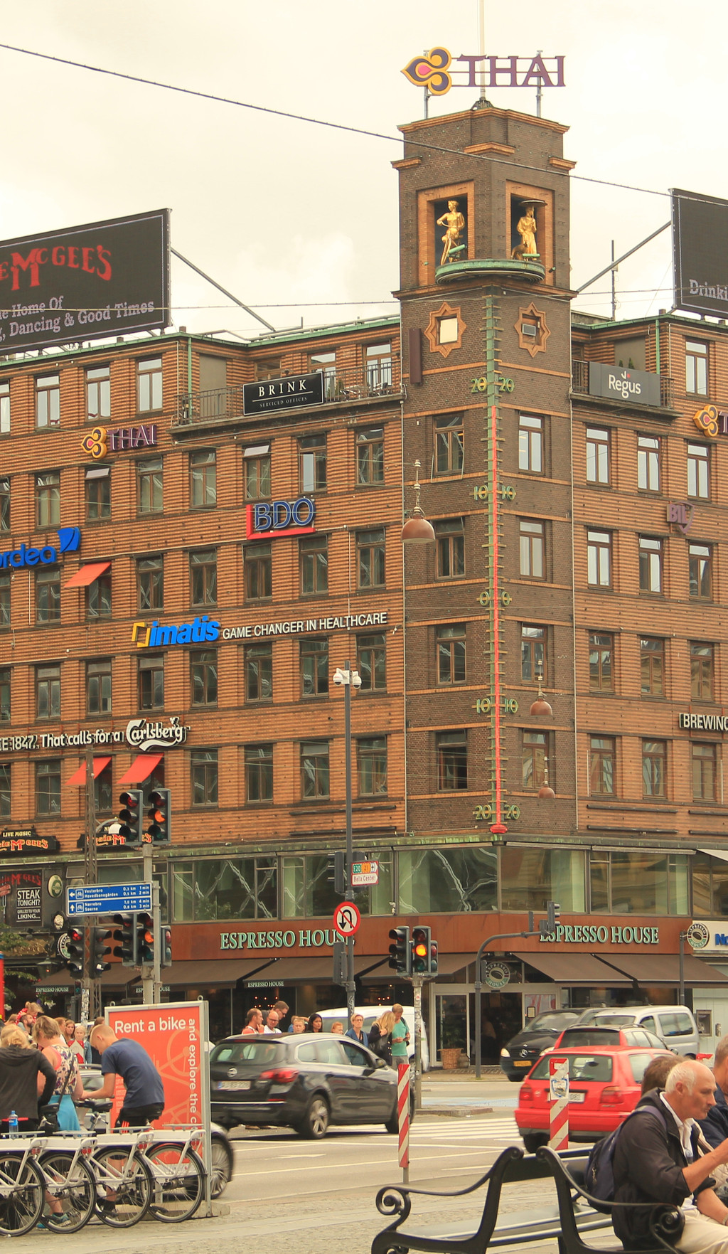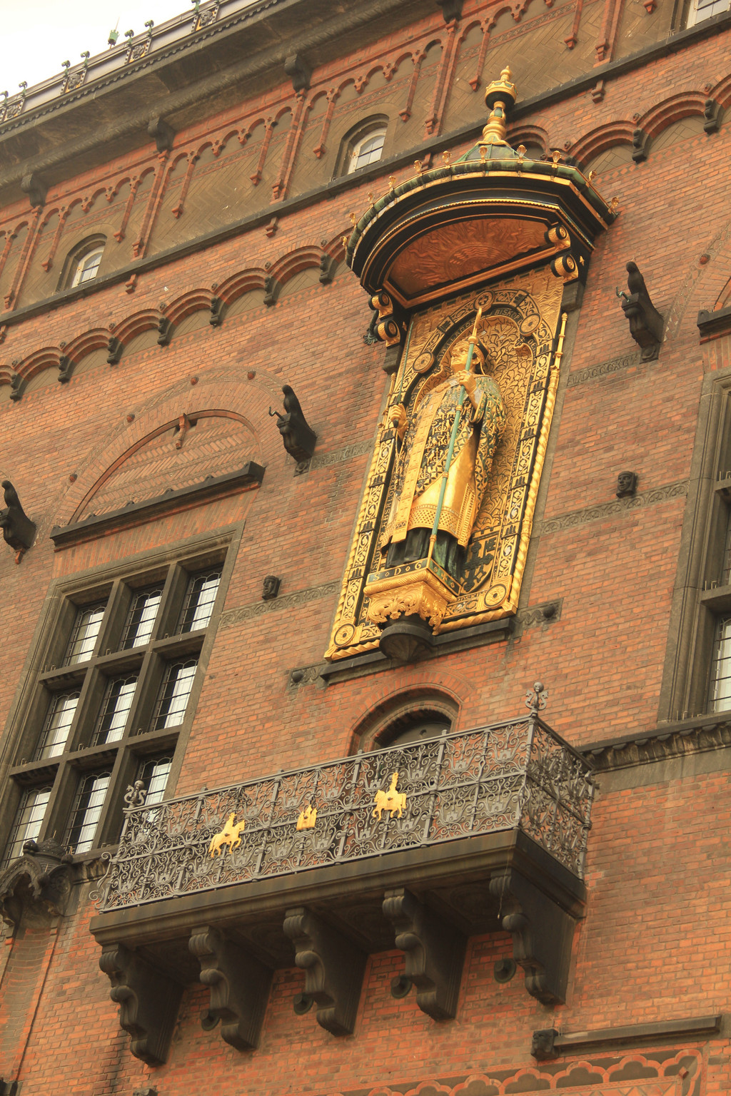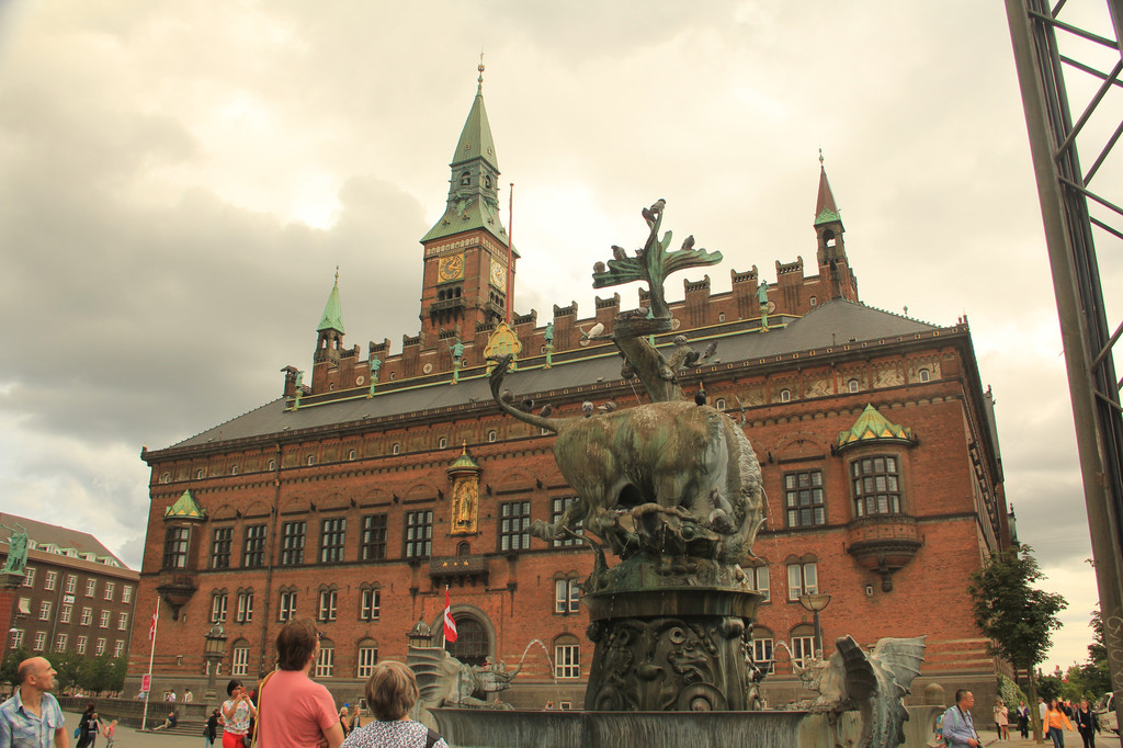 吃过午饭,整个下午时间就是参观市政厅广场和自由活动。丹麦不愧是童话之父安徒生的家乡,连市政厅也修建的颇有童趣。红砖砌就,方正的堡垒建筑配上尖顶装饰还有金色大钟,像极了国王的城堡。市政厅正门上方有一尊镀金塑像,一手持权杖、一手持剑,这是哥本哈根的创建者阿布萨隆大主教。市政厅上有个钟楼,高105米,每15分钟报时一次。市政厅对角的一幢建筑上,有一个大型室外温度计。实时显示着温度,温度计最高为30度,可见这里气候是多么凉爽。温度计上方有金色小人,如果下雨,打伞的小人就会转出来,让人又一次感受到童话王国的魅力。