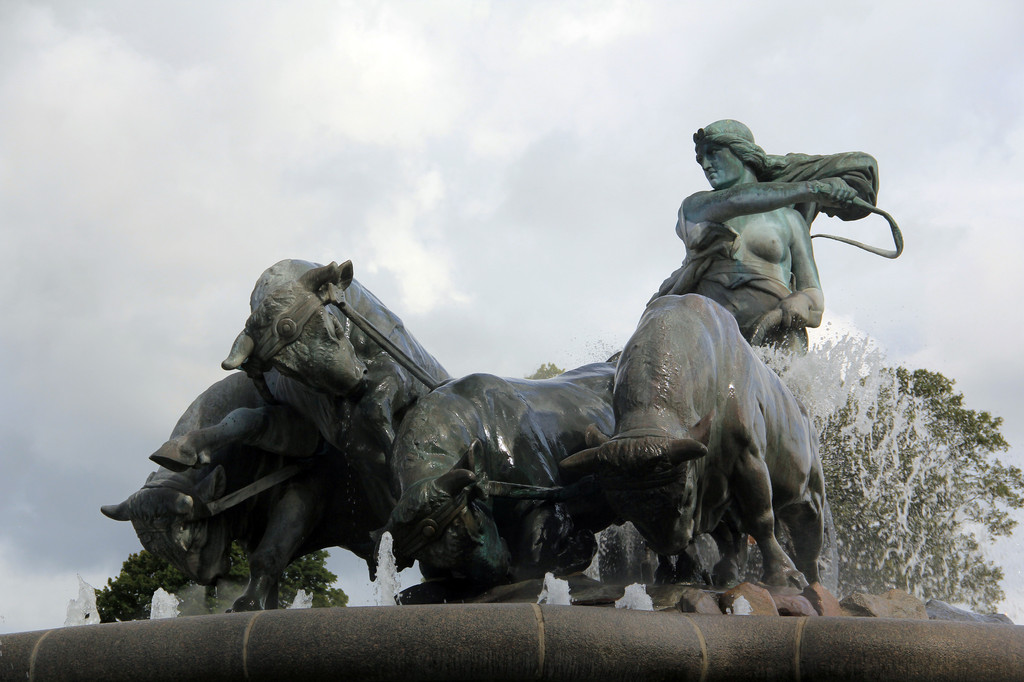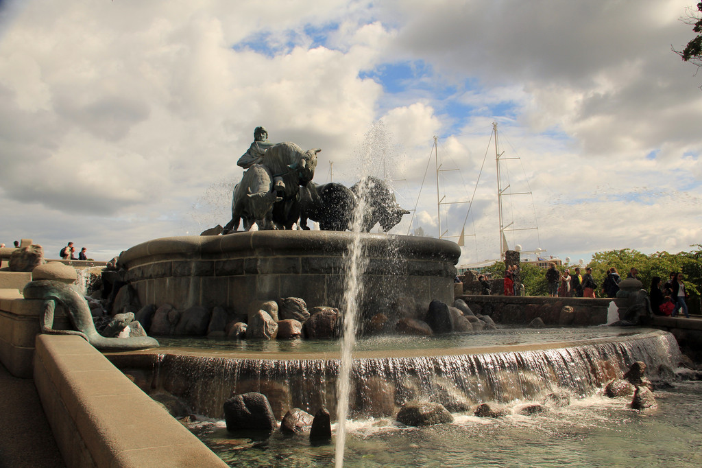 第二站吉菲昂喷泉,到达景点,人明显少了许多,只见一组女郎手持鞭子驱赶着四头牛套犁耕地塑像昂立其中,四周是飞溅的喷泉。景色非常漂亮,而更为奇妙的这座喷泉的传说。据说古代瑞典有个叫戈尔弗的国王,答应吉菲昂女神可以从瑞典国土上挖出一块土地,但限时一昼夜,挖多少算多少。于是吉菲昂女神就把她的四个儿子化为四条牛,用犁从瑞典国土上挖了一大块土地,并把它移到海上,从此,瑞典的国土上留下了一个维纳恩湖,而挖出来的土地就是现在哥本哈根所在的西兰岛。不管传说是否为真,但你从地图上看,维纳恩湖和西兰岛的形状确实极为相似。