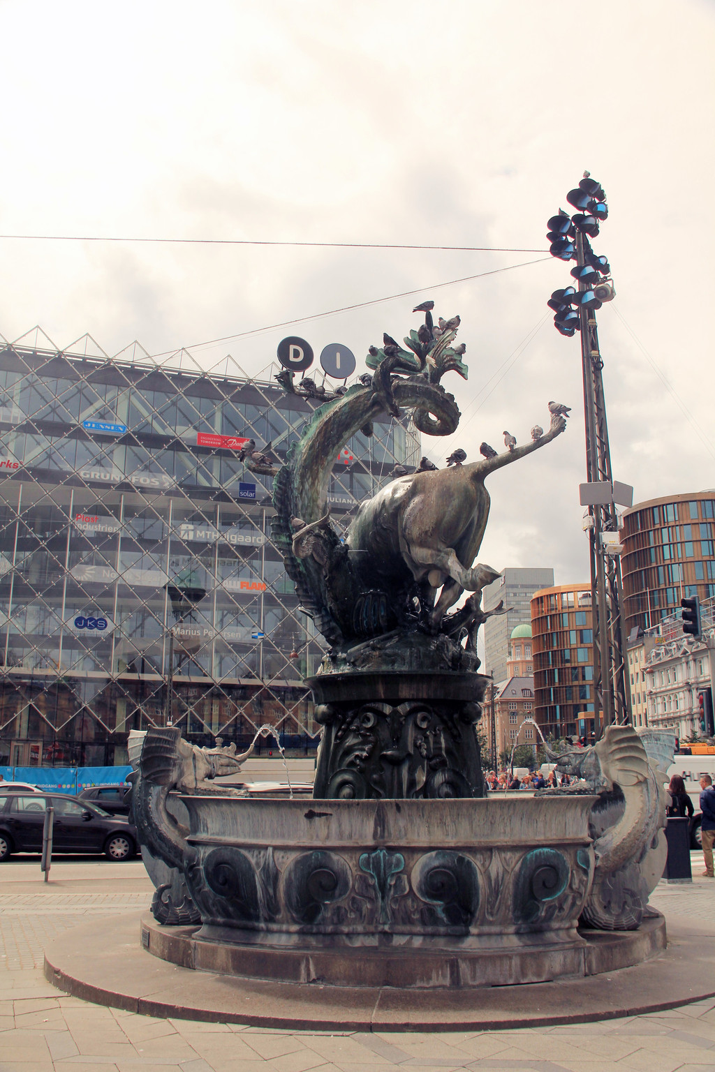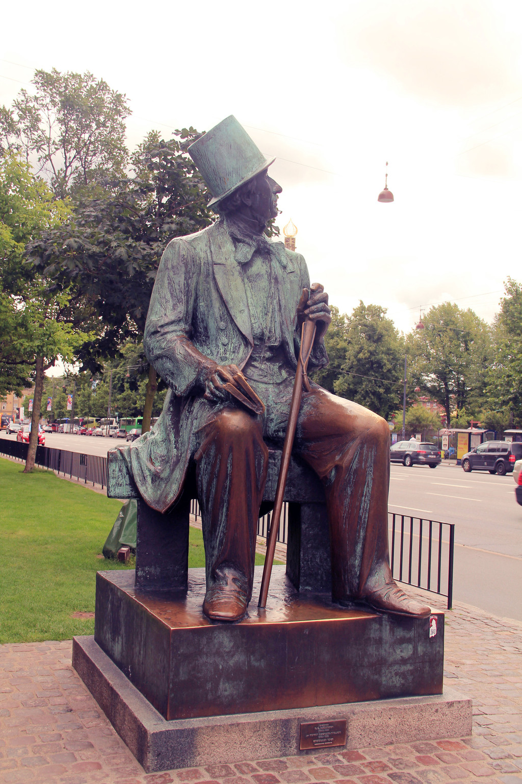 广场前还有一座牛龙雕塑喷泉,一头牛和一条龙在厮杀,因此又叫神牛降龙喷泉。而走出市政厅广场,左手侧马路边就是安徒生铜像,奇怪的是小美人鱼那挤满了拍照留影的游客,而这儿却不见有人拍照,我走上前,和这位为我童年带来无限欢乐时光的童话之父合影留念。