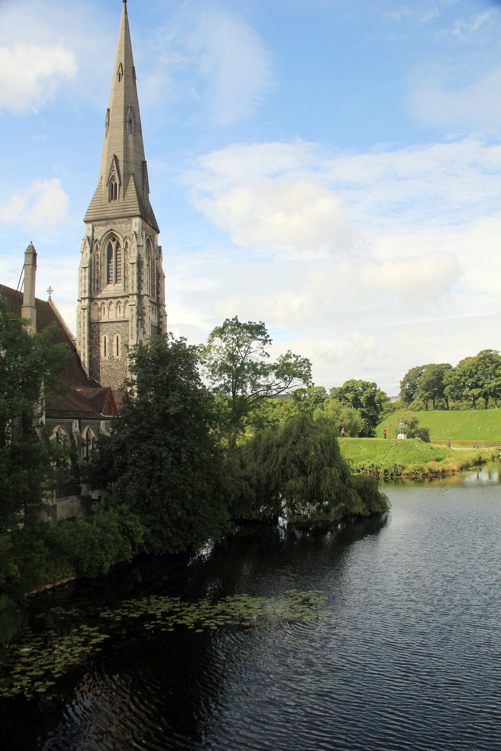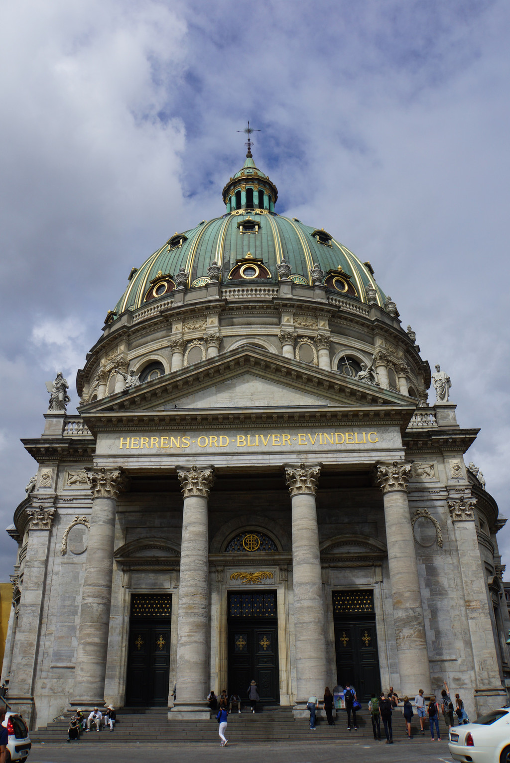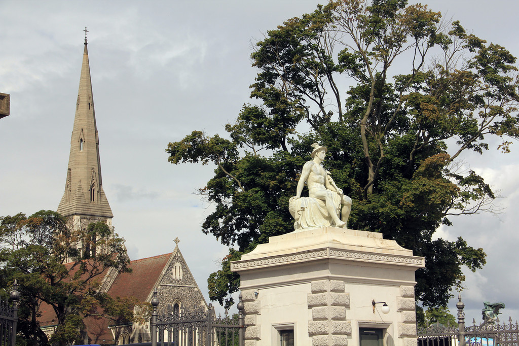 穿过皇宫,就是著名的大理石教堂了。腓特烈教堂历时一百多年建设,于1894年竣工和开放。由于大量使用了丹麦和挪威出产的大理石,因此当地人称之为“大理石教堂”。教堂外观最显著的特征就是丹麦最大的铜绿色圆顶,可惜由于维修,我们不能入内参观。只能在外面看了看,教堂四周和上层石围栏上有人物雕像,据说上层是圣经中人物的雕塑,教堂周围是著名神职人员的雕塑,我们看见基座上有人物的名字,可惜一个字不认识。