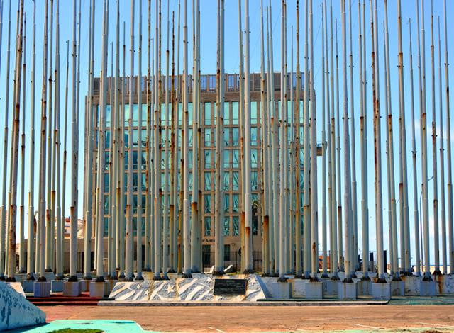 我们停靠的位置刚好距离美国驻古巴大使馆不远,只见大使馆门前悬挂着半旗,这是因为几天之前刚发生了拉斯维加斯的枪击案,为了悼念那些被恐怖分子杀害的数十名无辜的遇难者。大使馆建筑对面是一片如同树林状般的旗杆。说起这些旗杆还有着一段曲折的历史故事。