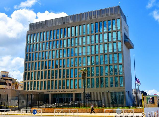 美国驻古巴大使馆,是一座外表平庸却绝不平凡的建筑,它是半个多世纪来美古关系风云变幻最好的见证。大使馆位于古巴首都哈瓦那著名的滨海大道上,是一幢灰色的七层混凝土建筑。大楼的外观就像一个火柴盒,缺乏建筑美感,与哈瓦那众多古朴而精美的西班牙式建筑一点也不搭调。但据说上世纪50年代大使馆落成时,其粗犷的造型还是非常前卫的,激发了不少人对美国文化的向往。