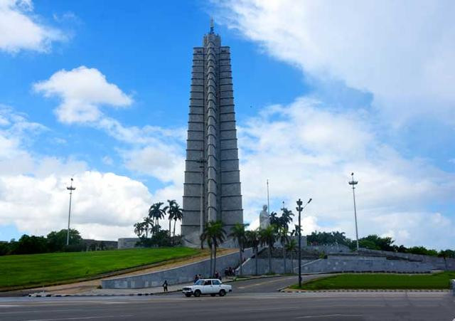 我们的大巴车从距哈瓦那市中心西南18公里处的哈瓦那何塞•马蒂国际机场进入市区大约半小时左右,首先抵达哈瓦那市中心著名的革命广场。大家下了车,只见宽阔的广场隔着一条马路矗立的何塞•马蒂纪念碑异常壮观。在广场一侧停靠着许多五颜六色的老爷车。