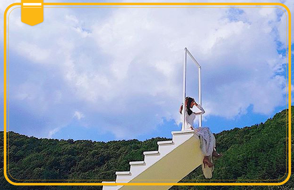 阶梯大概有十几阶,悬空而上,顶端有个一‘门’的形状,寓意「天堂之门」。而且为了成片的拍摄效果,阶梯两侧并没有安装扶手,所以上下阶梯的时候,需要格外小心。阶梯下方虽然设置了安全网,以防坠落危险,但是为了自身安全,尽量不要在阶梯上奔跑跳跃,或者做过于危险的动作。