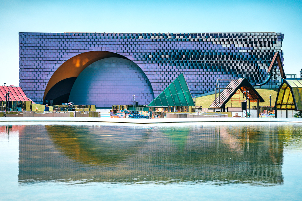 剧场的设计和景区相得益彰。鲜艳明快的色调,极具现代感的造型,很容易吸引大家的目光。