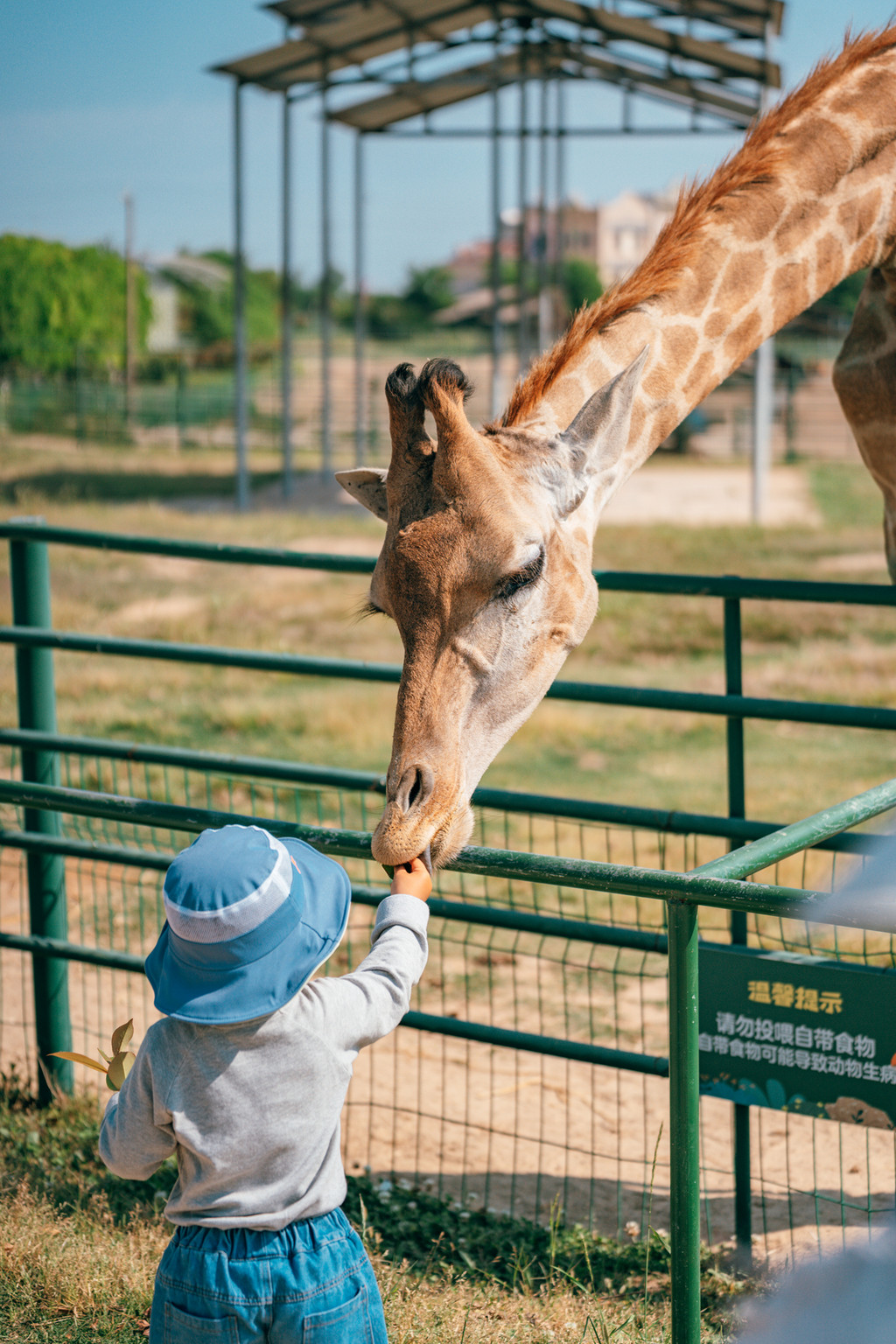 当然如果树叶拿的太小,就只能像这个小朋友一样接受舔手手的结局了~所以喂完长颈鹿记得要去洗手~