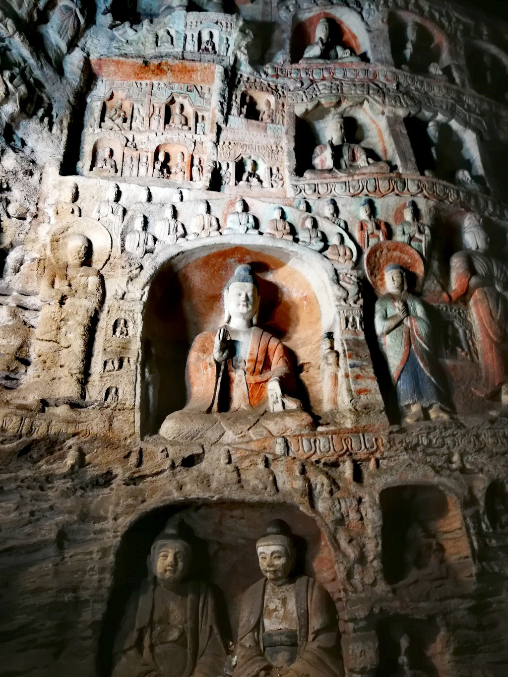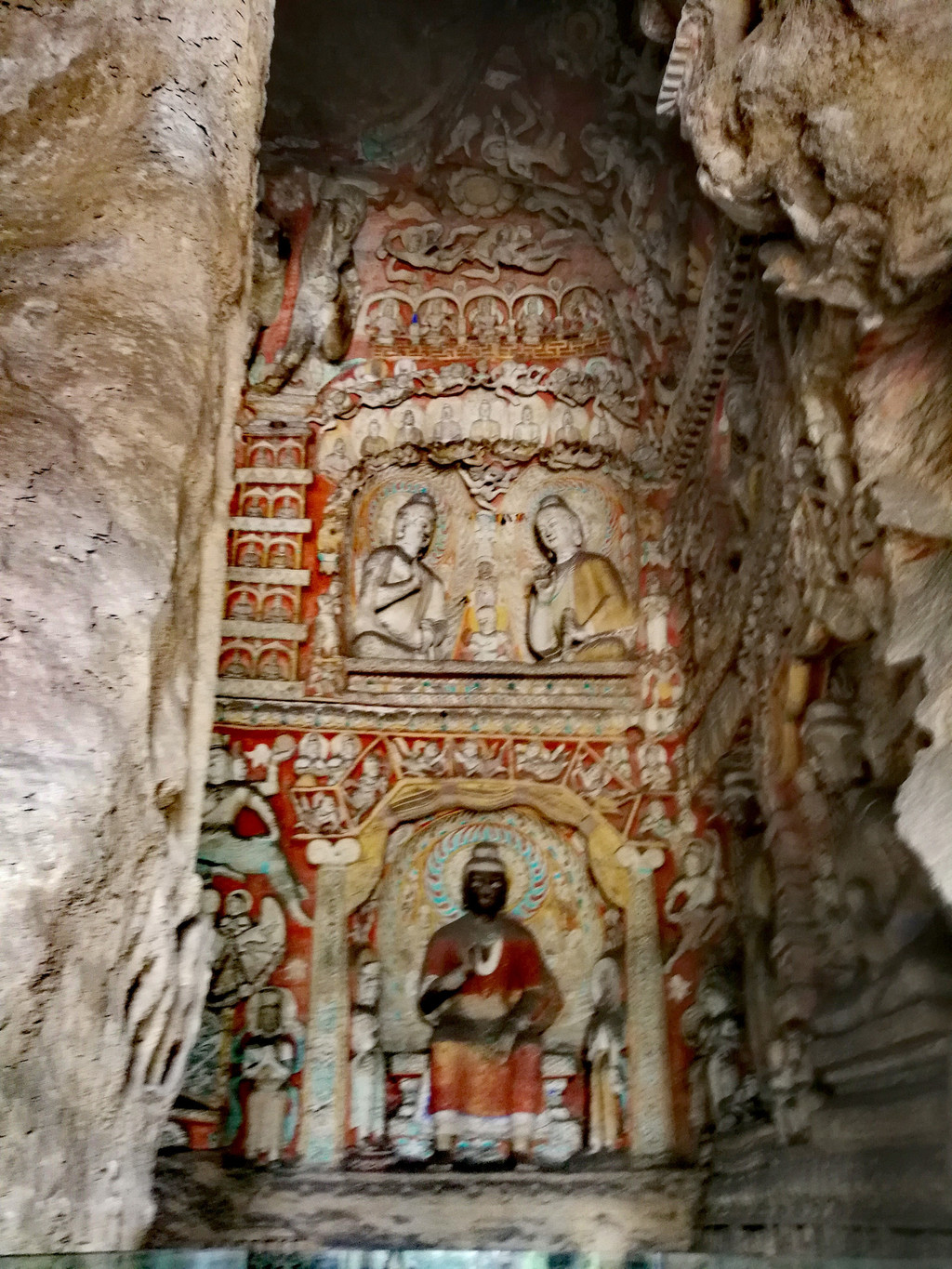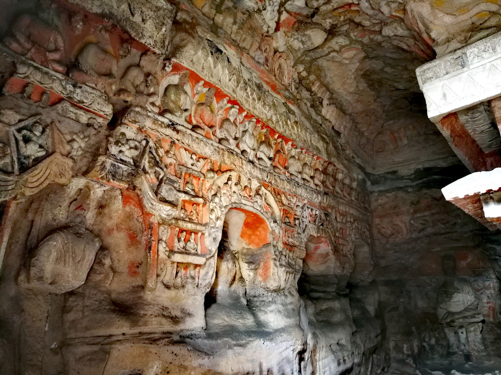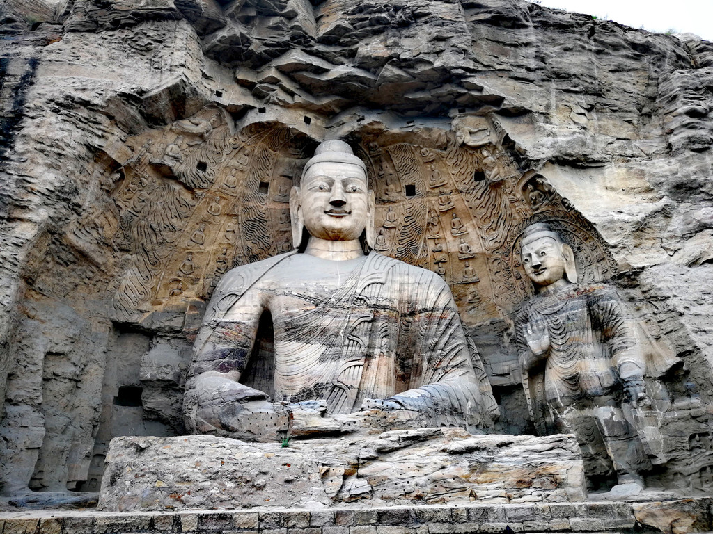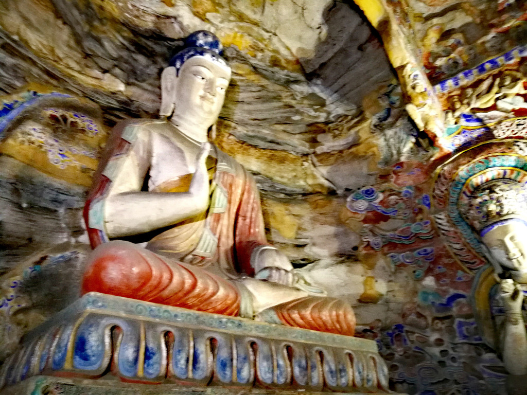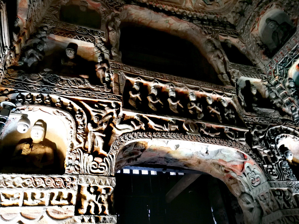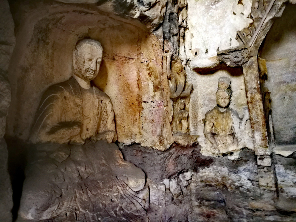 昙曜在大同云冈主持开凿最初的五窟佛像,以北魏开国以来的五位皇帝仪容为蓝本,这也显示佛教充分迎合了统治者的需要。这五窟就是今天的云冈第16-20窟,第16窟佛像酷肖支持昙曜开凿石窟的文成帝,而第20窟最为典型的露天大佛则是依照北魏开国皇帝道武帝形象刻制。从此之后,北魏统治者以及鲜卑贵族继续开凿,一直到北魏孝文帝迁都洛阳后才基本停工——北魏统治者到洛阳后又在洛阳开凿龙门石窟,说起来云冈与龙门两石窟,算是“亲兄弟”了。