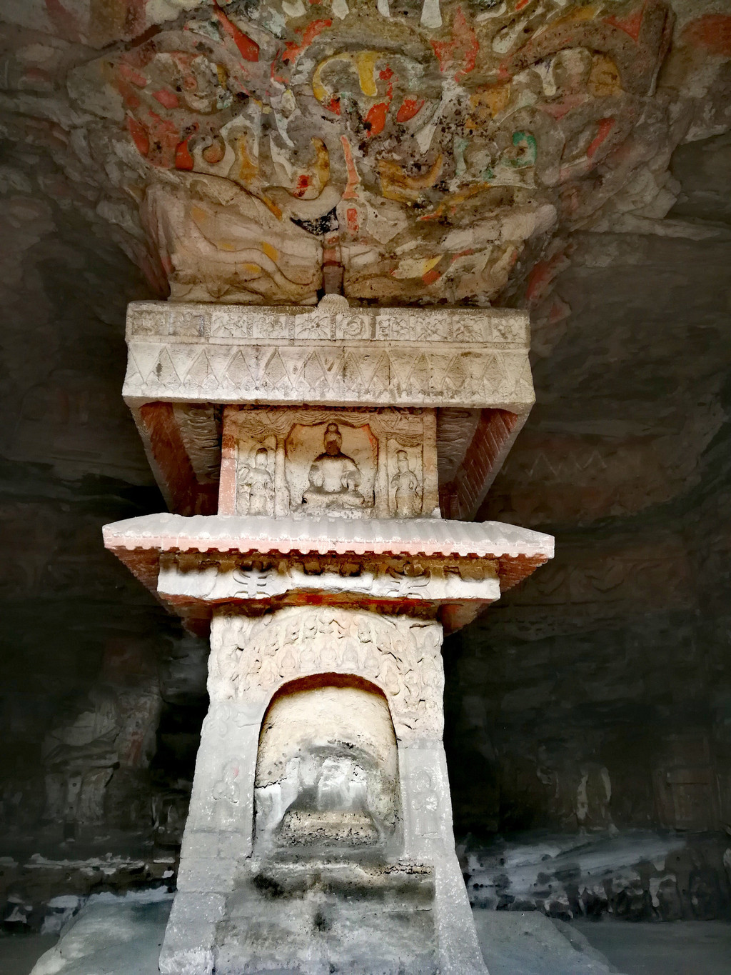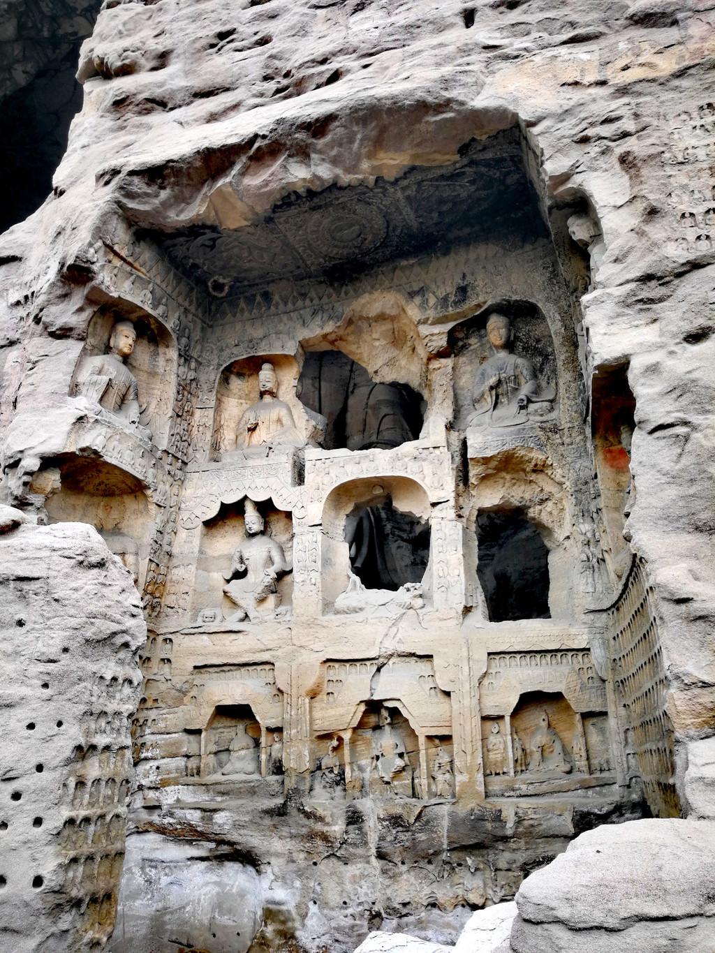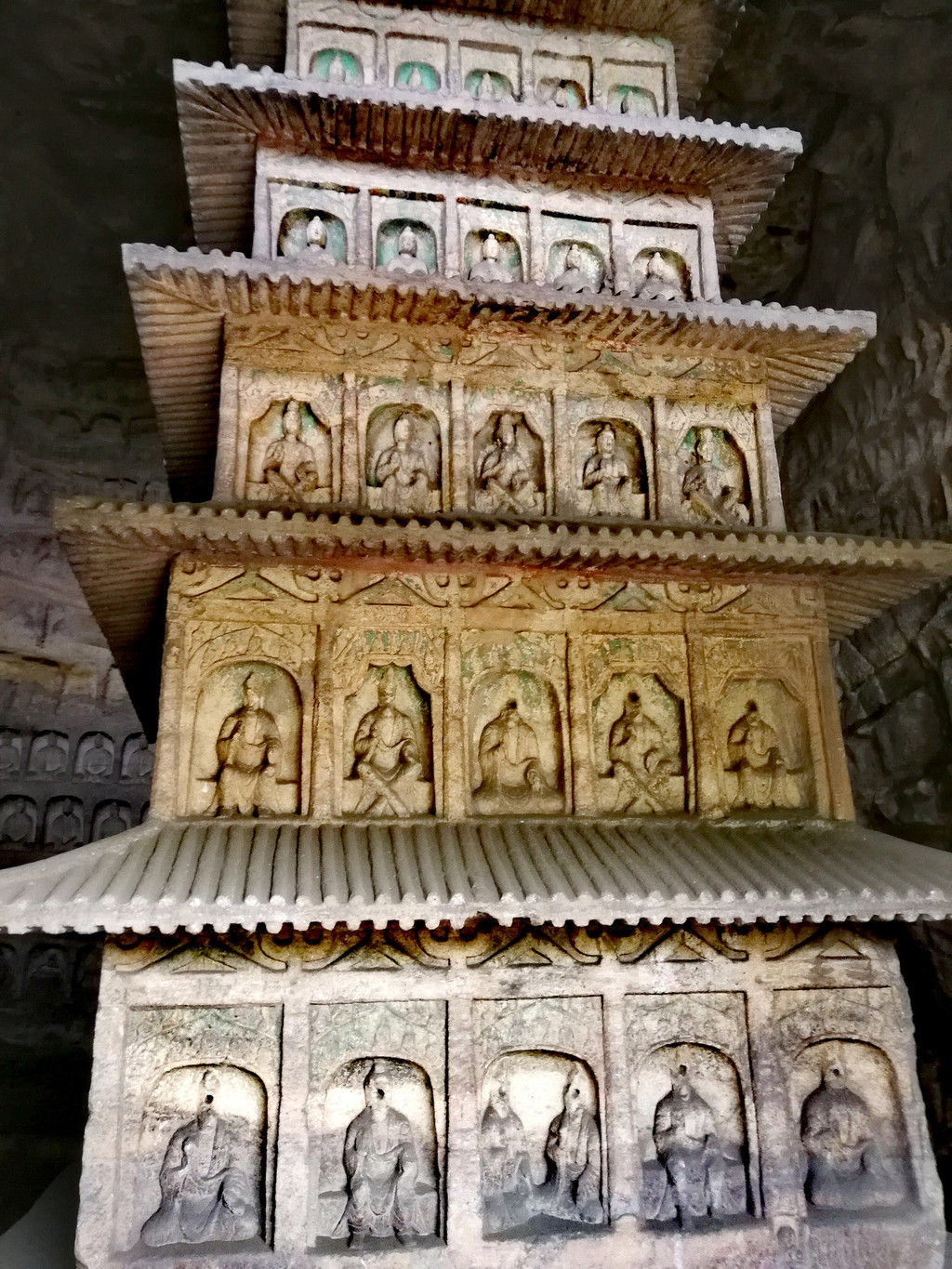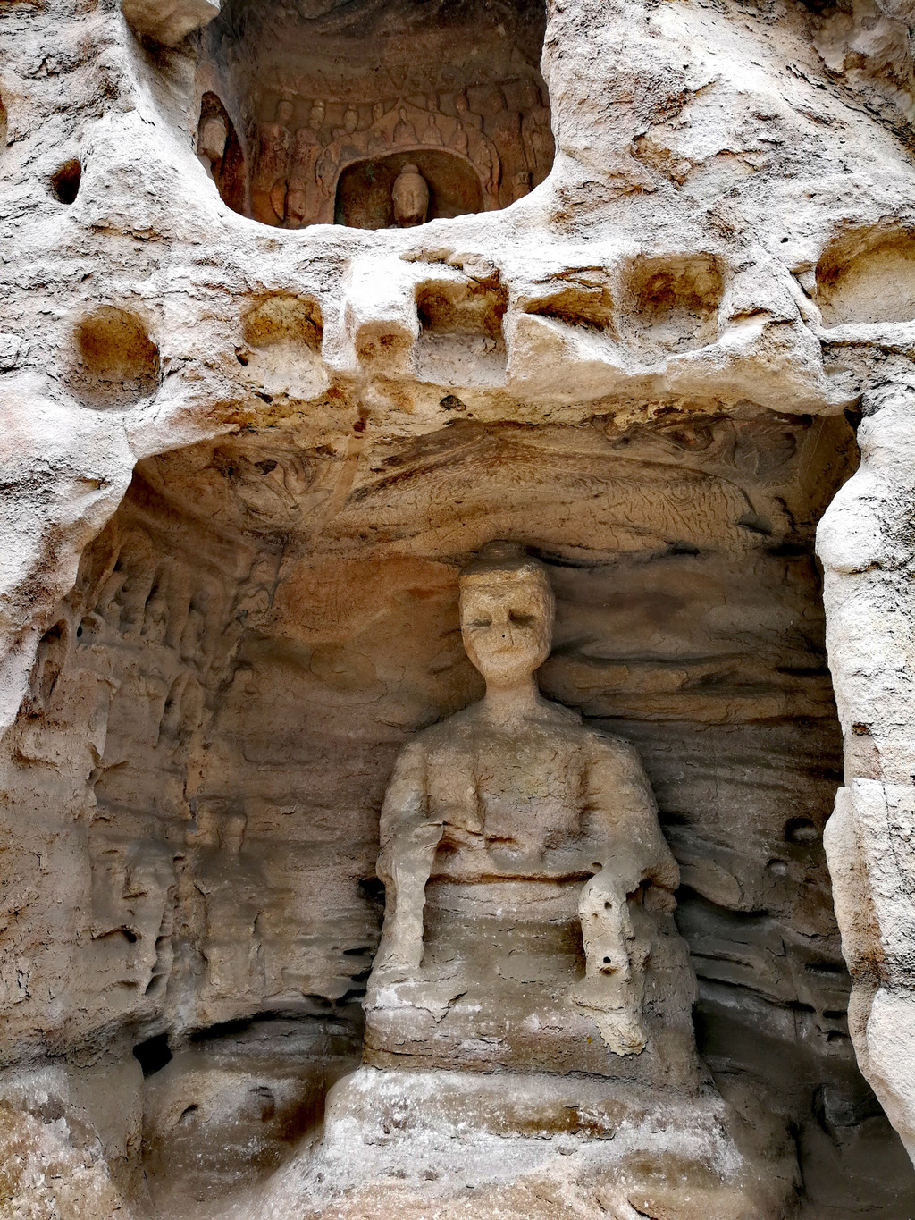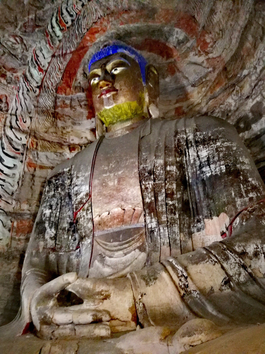 昙曜在大同云冈主持开凿最初的五窟佛像,以北魏开国以来的五位皇帝仪容为蓝本,这也显示佛教充分迎合了统治者的需要。这五窟就是今天的云冈第16-20窟,第16窟佛像酷肖支持昙曜开凿石窟的文成帝,而第20窟最为典型的露天大佛则是依照北魏开国皇帝道武帝形象刻制。从此之后,北魏统治者以及鲜卑贵族继续开凿,一直到北魏孝文帝迁都洛阳后才基本停工——北魏统治者到洛阳后又在洛阳开凿龙门石窟,说起来云冈与龙门两石窟,算是“亲兄弟”了。