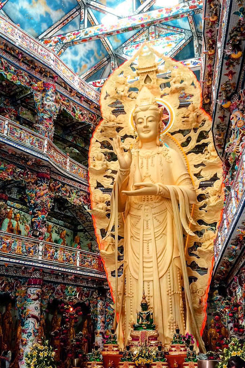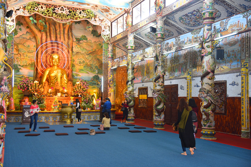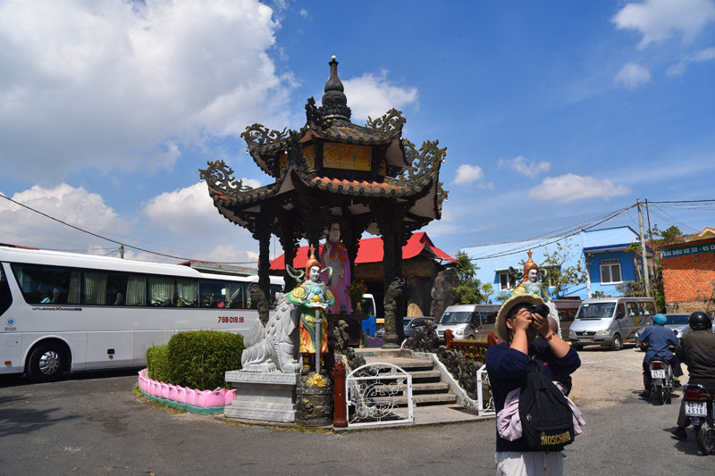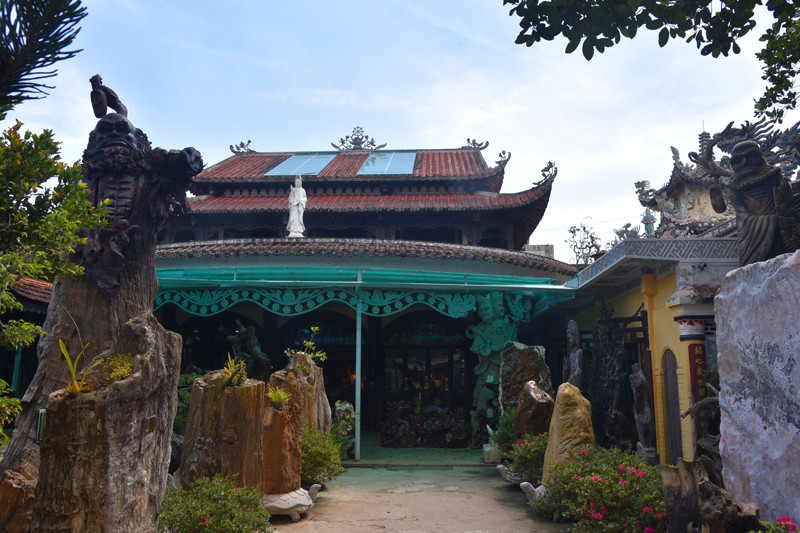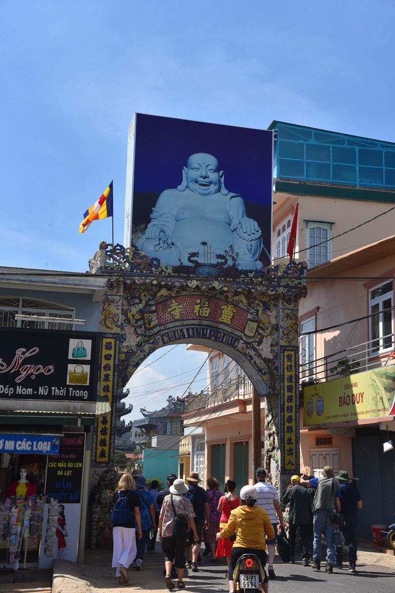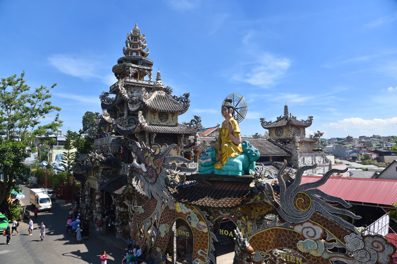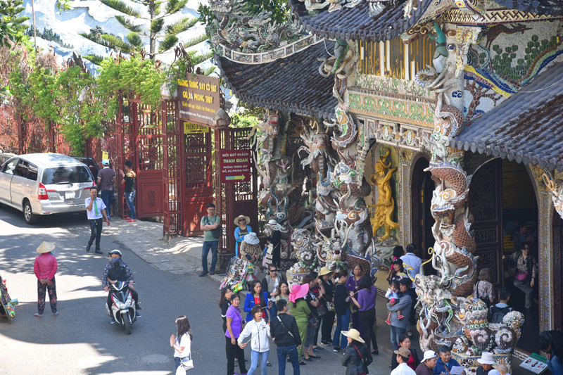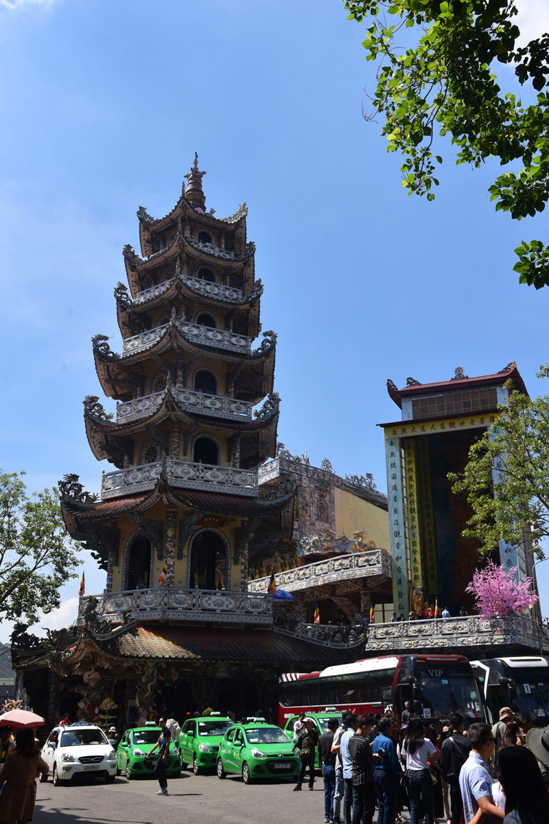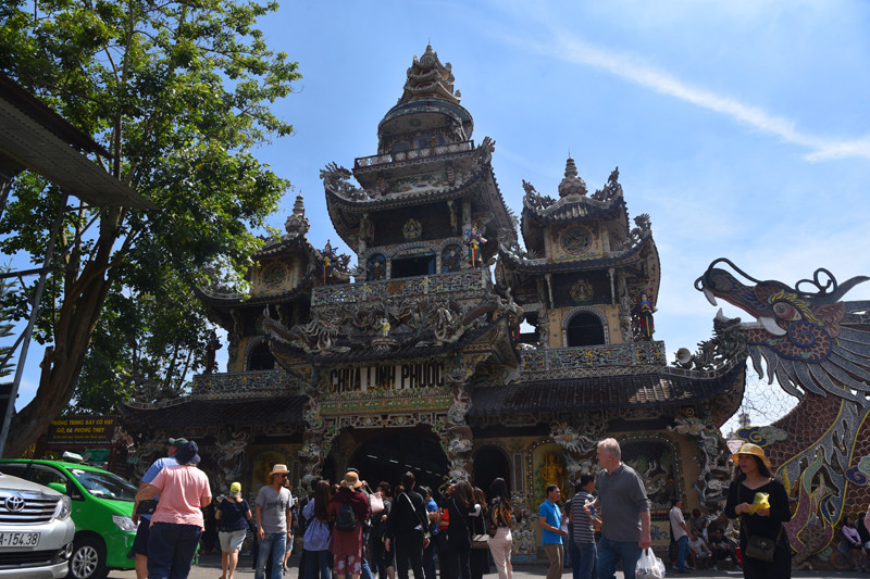 过牌门再前行,来到了灵福寺。碎瓷片镶嵌外墙是越南建筑的一大特色,灵福寺将这种艺术发挥到淋漓尽致,远看就像一件巨大的镂空雕刻工艺品。在明媚阳光照耀下,在蓝天白云映衬下,碎瓷片镶嵌的灵福寺尽显浮华的光芒。