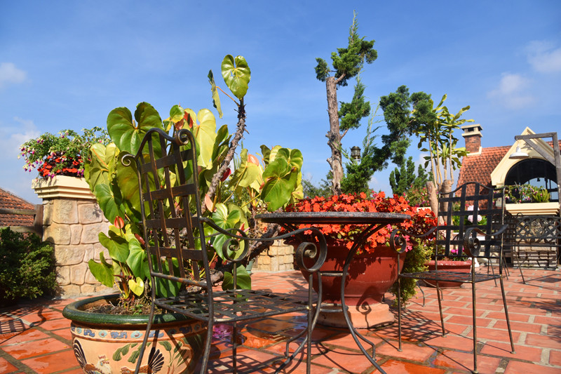 来的都是客,即使不消费,你也可以免费自由参观,很佩服酒店的经营之道。在酒店里随意看了看,来到小平台花园驻足,这里种植和摆放了很多的植被和鲜花,有后面的古堡做背景,无论从哪个角度,都非常适合仙女们拍照。