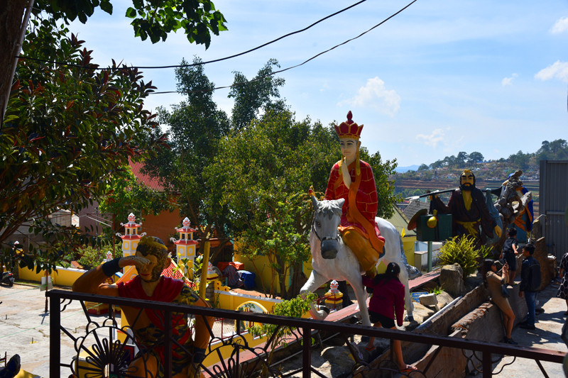 寺庙外是川流不息的汽车和游客,干菊花做成的巨型观音像,唐僧师徒四人的塑像,这里的一切让我好奇。七层佛塔内放置一口大钟,香客们将祈福的话写在纸上并贴到钟上,每个人可以敲钟三次,登上佛塔可远观灵福寺风貌。
