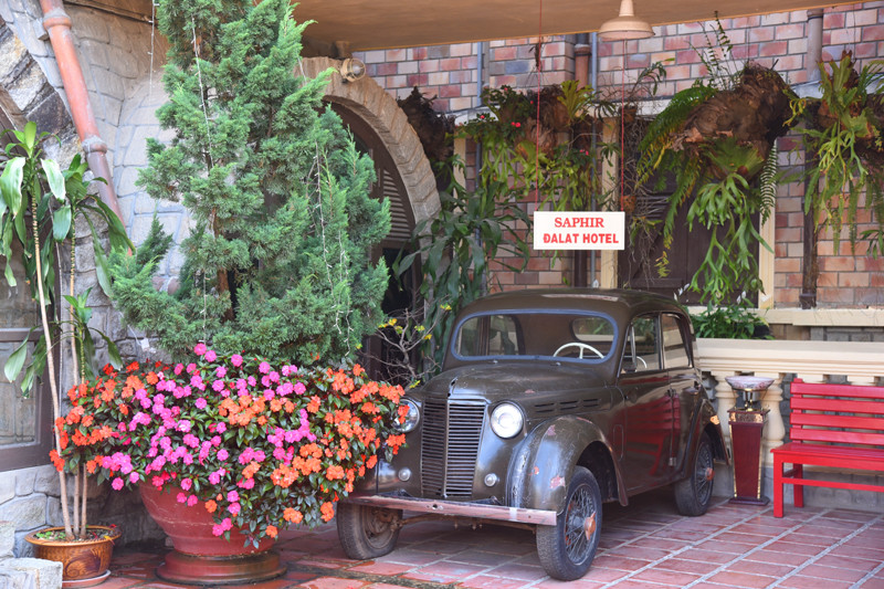 沙非大叻酒店位于山坡上,由法式古堡改建而成,老式的木质电梯,停放的老爷车,以及店主人众多的收藏古董,屋子里的每一处细节和装饰风格,无不透露着年代感。仿佛这里的每一个角落都有故事,充满了复古胶片的迷离。