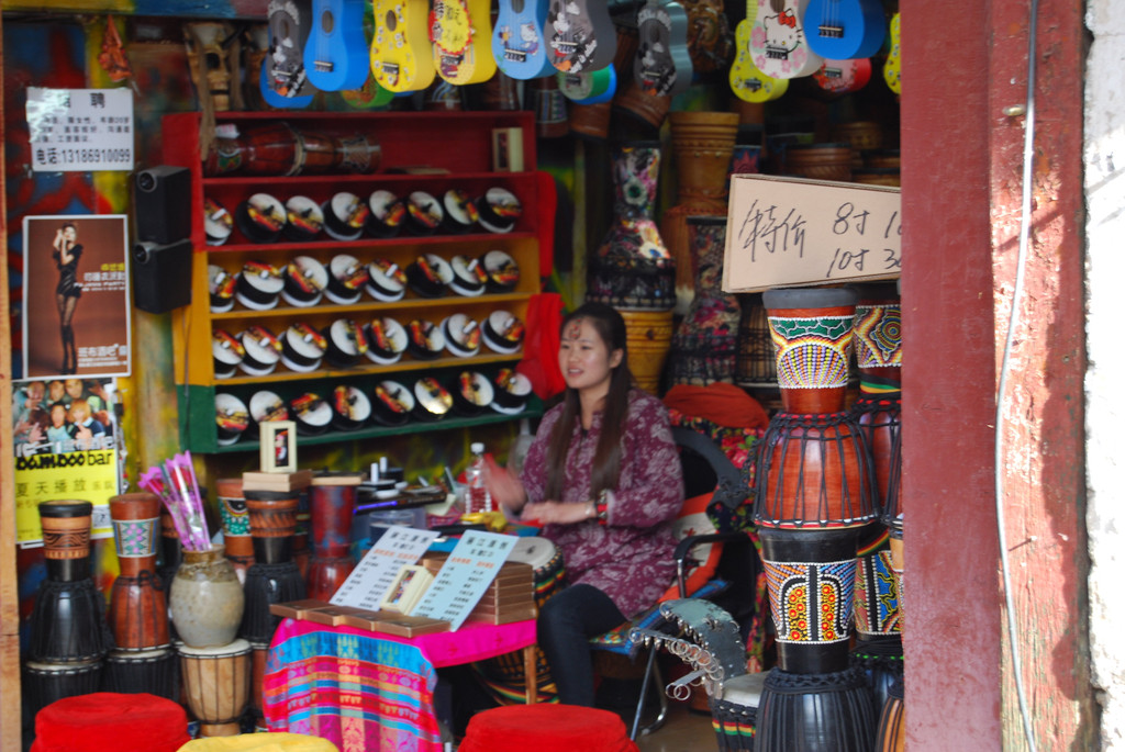 一边打手鼓一边唱歌的乐器店“女老板”(我想应该是女店员,因为这样的店铺有很多,打鼓的姑娘一个赛一个的漂亮!老板娘的话不见都会这么漂亮吧。)一边卖手鼓一边卖音乐CD(五元一张,当地酒吧歌手原创)。。。