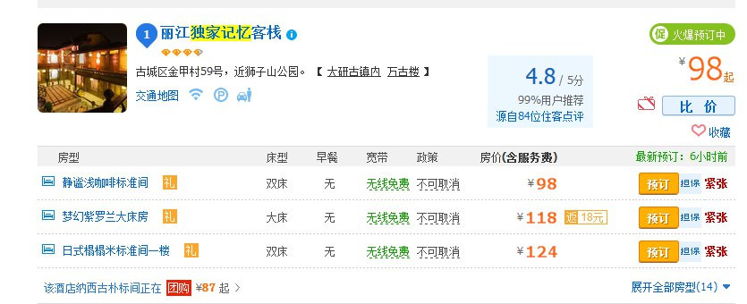 丽江独家记忆酒店,提前一礼拜订的的特价房间,标间98.00元。去之前有人建议可以一天换一家客栈,这样可以体会一下不同的特色,但是天天换来换去太麻烦了,所以干脆就定了两天。位置不错,在大研古城与新城的交界处,交通便利。就在狮子山脚下,翻过狮子山就是古镇四方街。