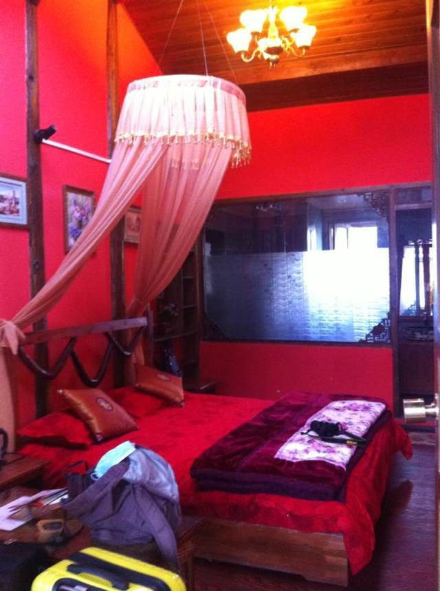 这家酒店每个房间都有自己的主题,去的时候,标间已经没有了,所以两位姑娘受累只能挤一挤大床房。不过这个大床房还超级棒,属于蜜月套房。大红色,有一块玻璃房顶,可以躺在床上看星星。135.00一天