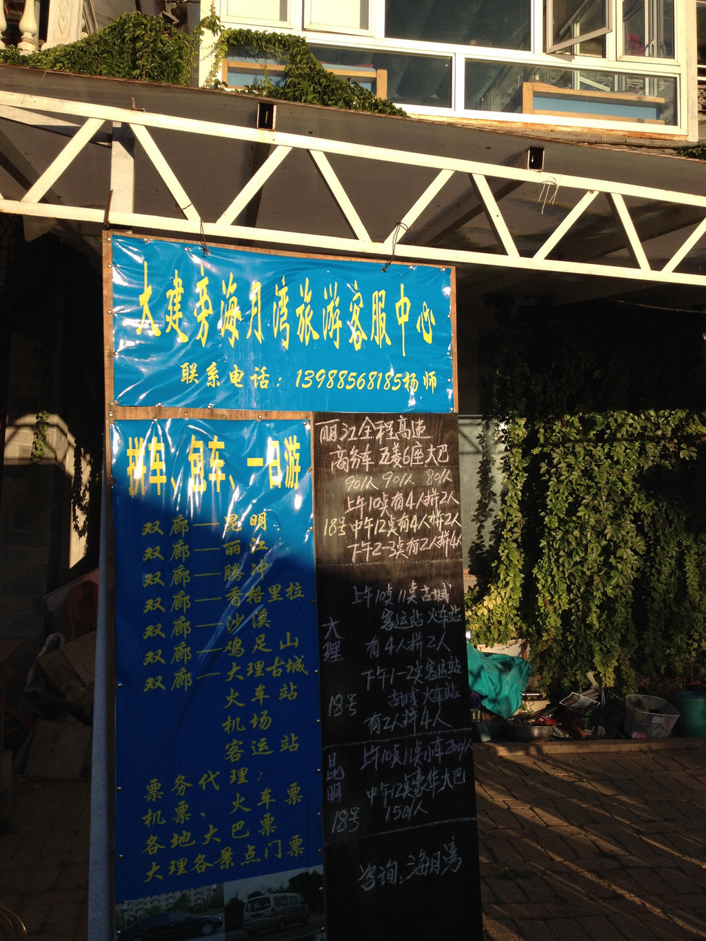 没到双廊之前,感觉双廊的地理位置较偏僻,交通应该不是很方便。结果到了以后才发现我又错了。双廊现在的主要经济支柱就是旅游,虽然缺少国营的长途车,但是私人包车业务是非常发达的,到处都有拼车的广告。