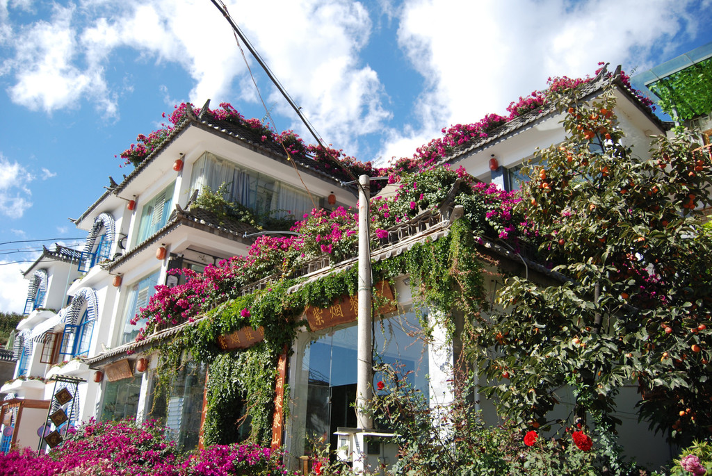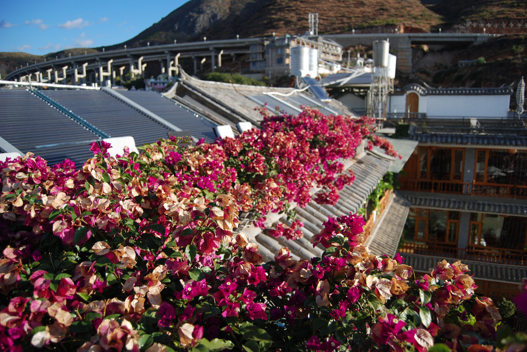 经过两天一夜的旅途,终于抵达了我预定的酒店,大建旁村的“紫烟庄园”客栈~~,离传说中的“海地生活”和“半岛63”客栈不远。整个客栈被三角梅覆盖,十分有特点。且在楼上便可以看到洱海,意向不到的好,对得起155一天的价格。超值`~~
